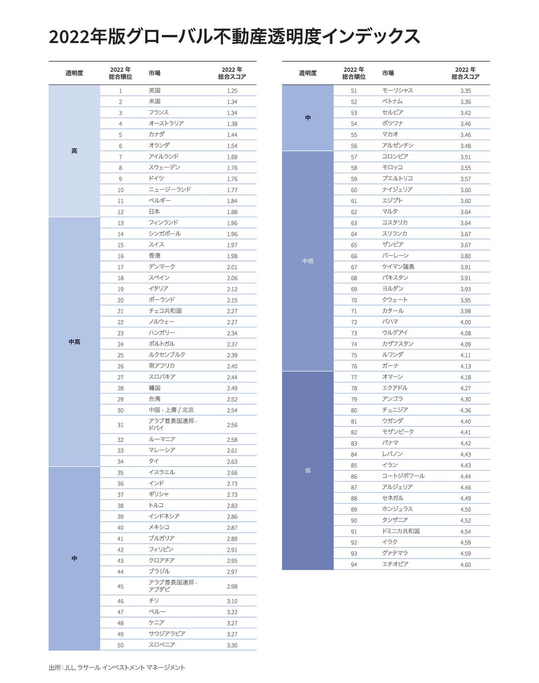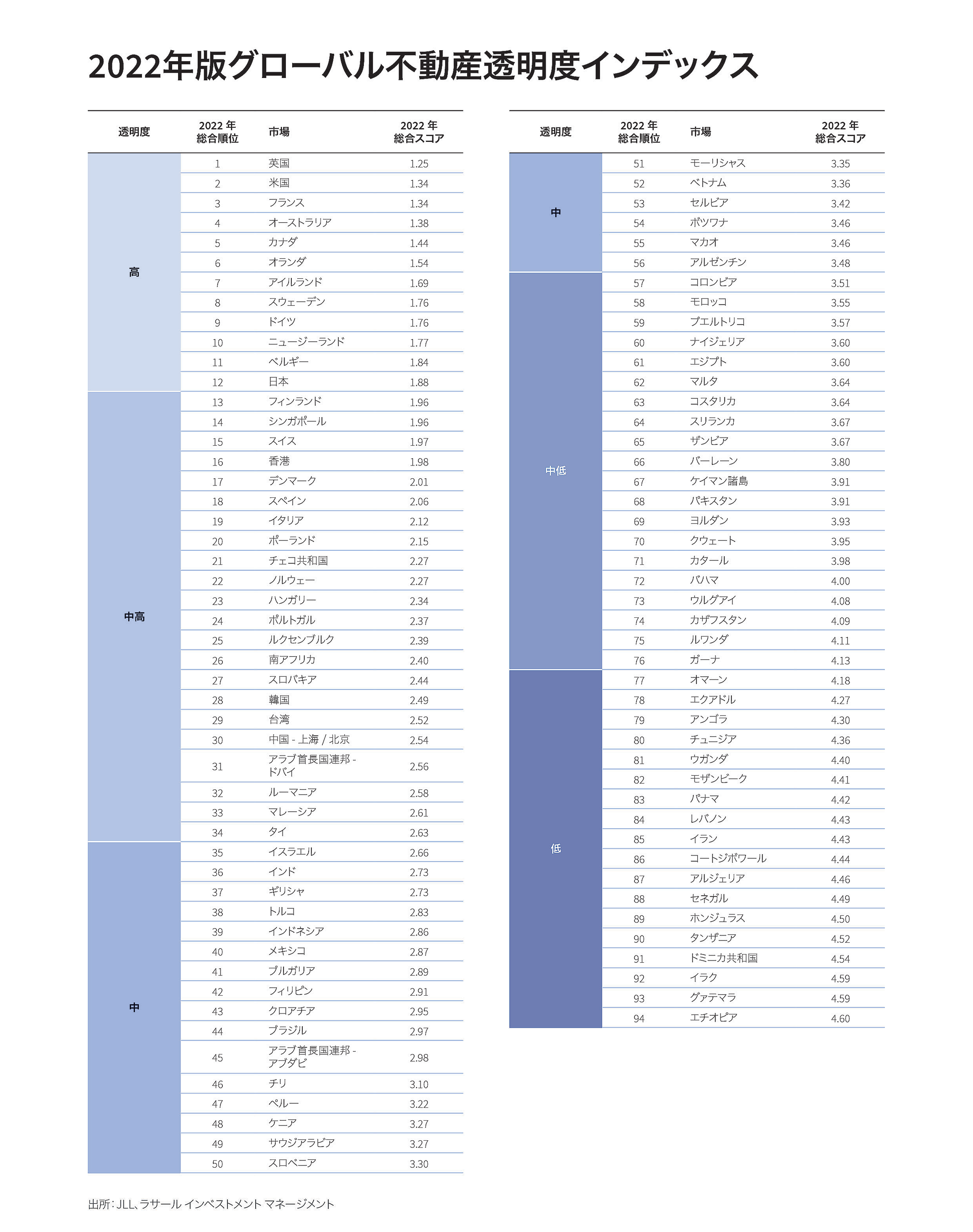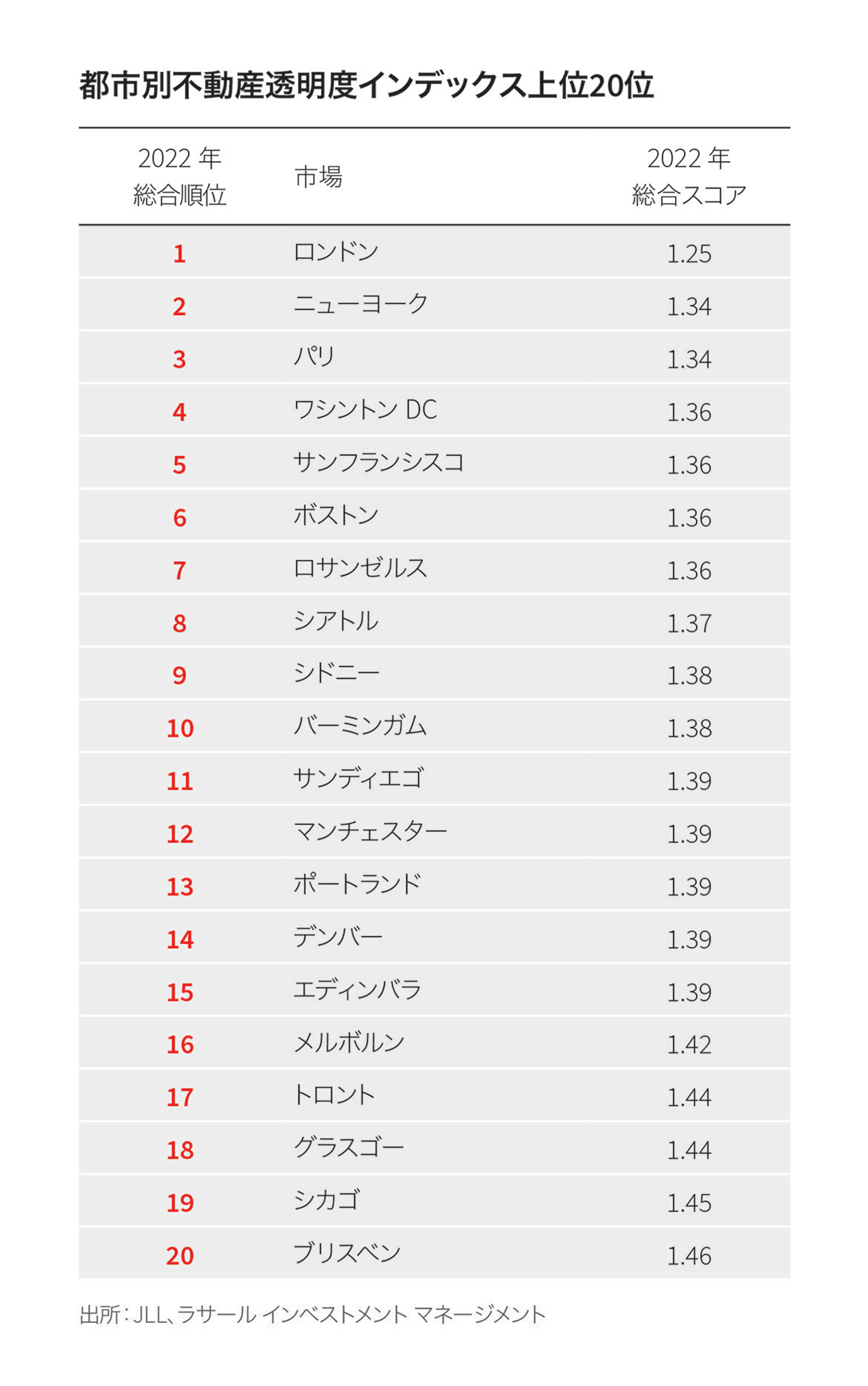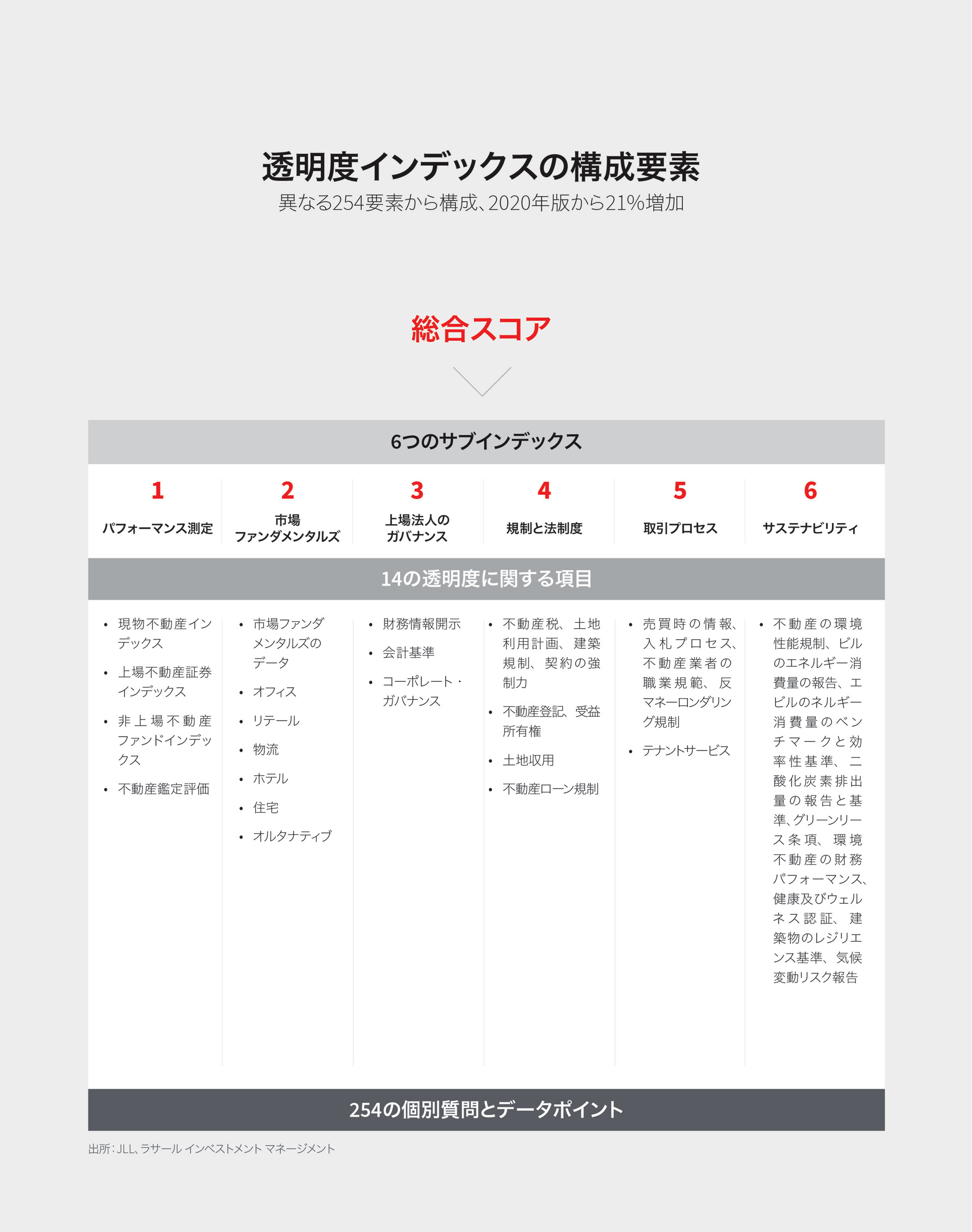 レポートの詳細はこちら( https://www.joneslanglasalle.co.jp/ja/trends-and-insights/research/global-real-estate-transparency-index )をご覧ください。