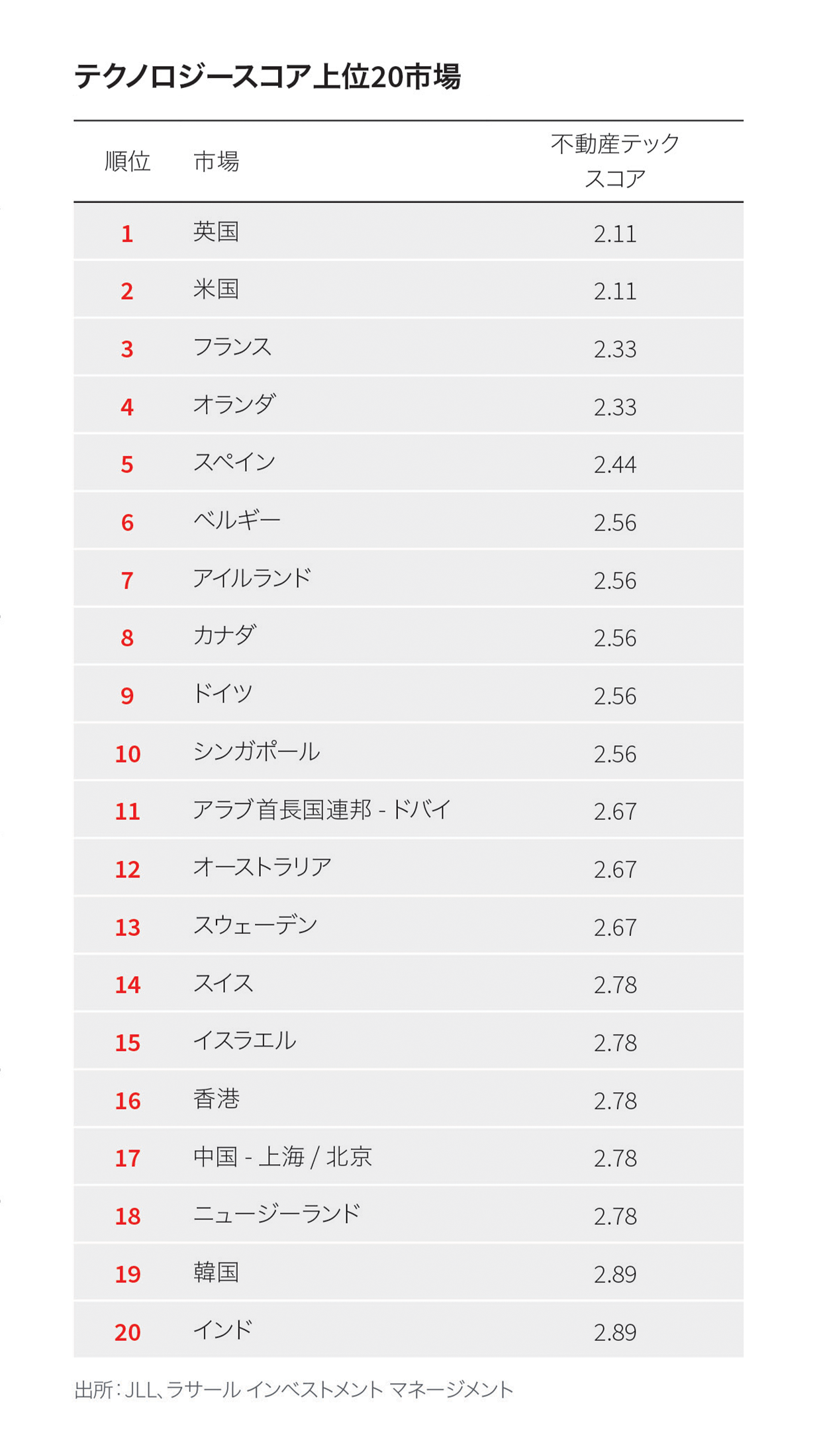 - 透明度「高」の市場ではテクノロジーの導入も拡大しており、テクノロジーのサブインデックス※5でも1位英国、2位米国、3位フランスが占めた。テクノロジー企業のエコシステム、先進的なデジタルインフラ、ベンチャーファンドによる投資を背景に、これらの国々では不動産セクターの膨大な量の、詳細かつリアルタイムな情報が入手可能になっており、取引プロセスの迅速化が可能になっている。一方で、デジタル化が進んでいない市場との情報格差は拡大している。