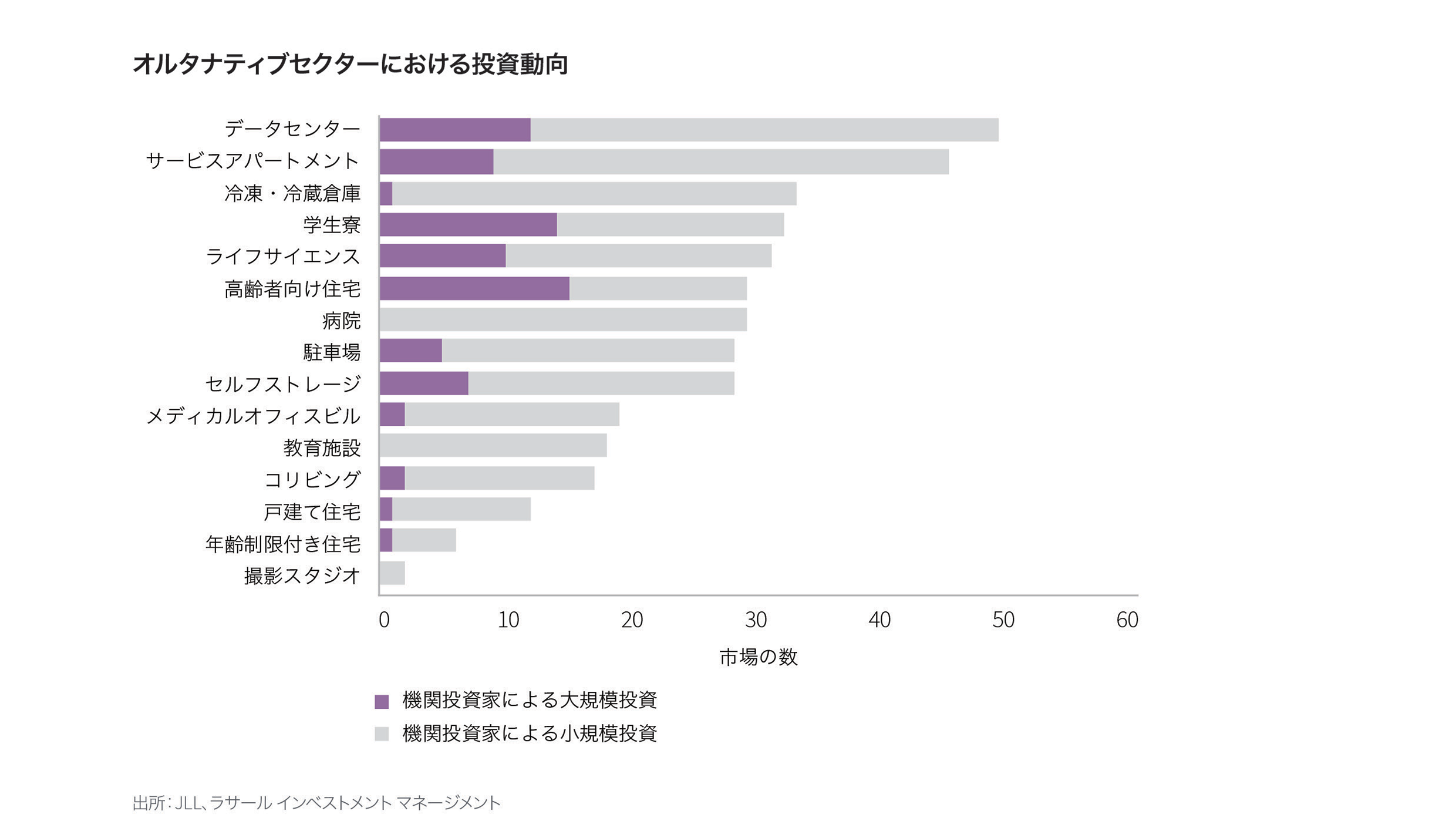 - 近年、機関投資家によるオルタナティブ不動産への投資が増加※6しており、2022年版では調査対象を12 セクターから15 セクター(戸建て賃貸住宅、年齢制限付き住宅、撮影スタジオを追加)に拡大した。一方で、透明度が高い市場においてもオルタナティブセクターの市場データが未だ限定的であるのも事実で、改善の余地が大きい。