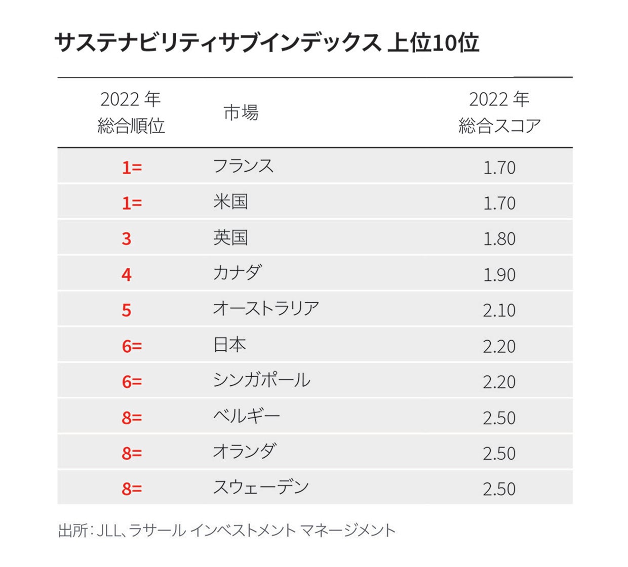 - 今回最も大きく改善した要素がサステナビリティであり、そのサブインデックス※4の1位にフランスと米国が並び、3位が英国と「高」市場のトップ3が占めた。上位市場では企業に対する気候変動リスク報告の義務付け、さらに建物レベルのエネルギー効率や排出量の情報収集・共有が進んでおり、他の市場もこれに続くことが予想される。日本は6位だった。