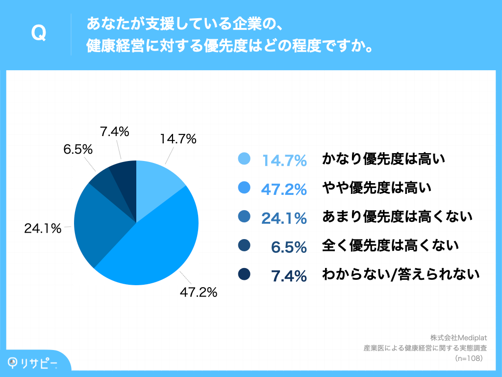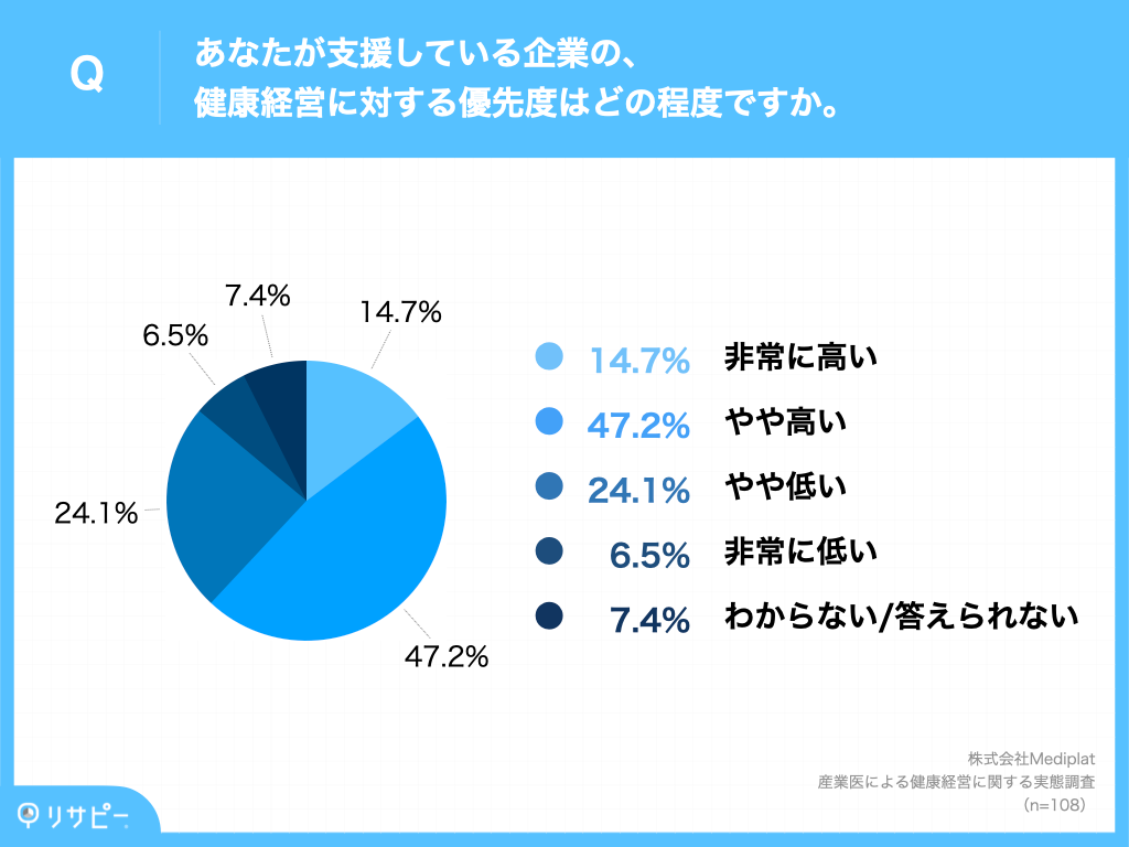 次に、「支援している企業の健康経営に対する優先度」を調査したところ、「優先度は高い」と回答した産業医は61.9%(「かなり優先度は高い」14.7%+「やや優先度は高い」47.2%)となり、健康経営に関して企業の優先度が高いことがわかりました。