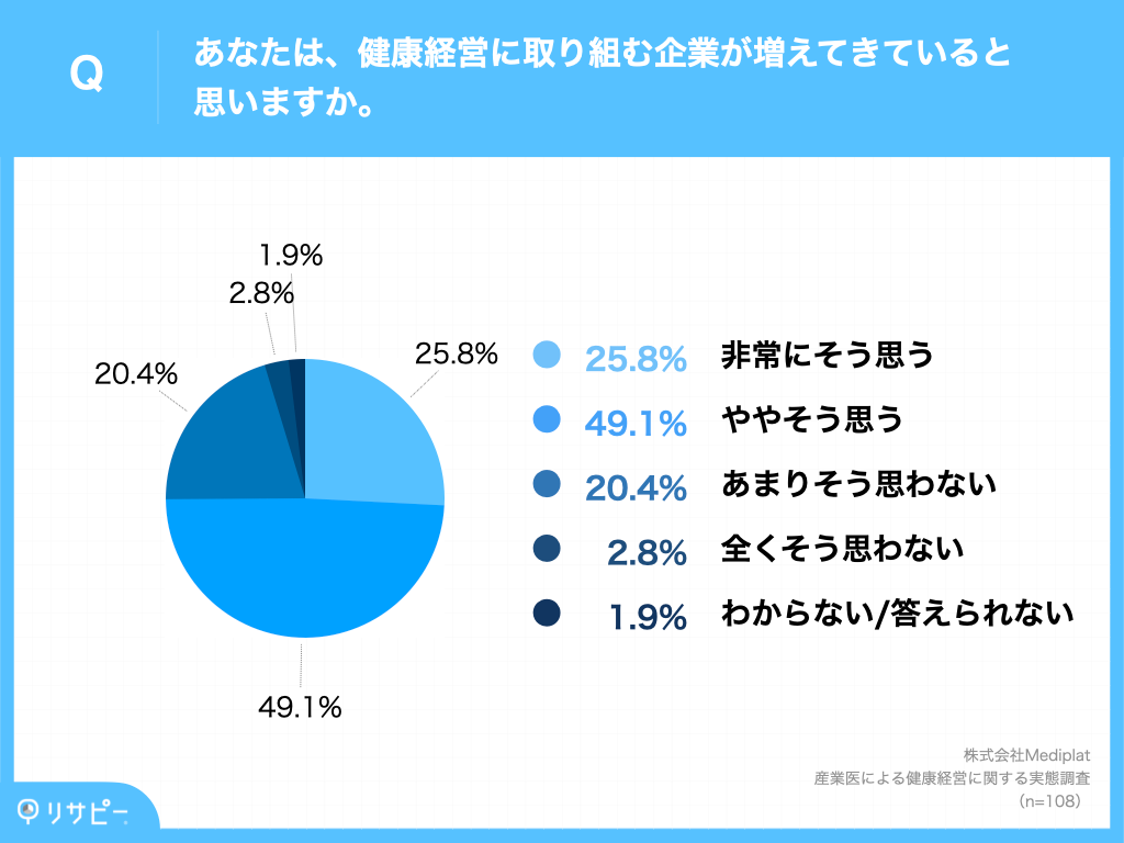 まず初めに、「健康経営に取り組む企業が増えてきていると思うか」を調査したところ、74.9%(「非常にそう思う」25.8%+「ややそう思う」49.1%)の産業医が健康経営に取り組む企業の増加を実感している結果となりました。調査から、健康経営に対して企業の関心が高まっていることが見受けられます。