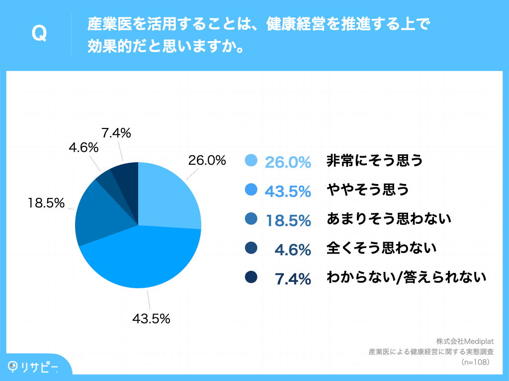 「産業医を活用することは、健康経営を推進する上で効果的か」を調査しました。その結果、69.5%(「非常にそう思う」26.0%+「ややそう思う」43.5%)の産業医が効果を実感しているようです。