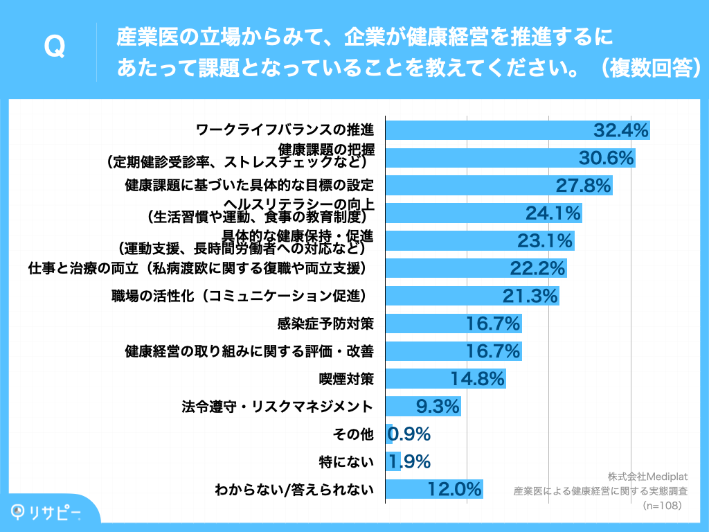 一方で、「企業が健康経営を推進するにあたっての課題」については、「ワークライフバランスの推進」が32.4%、「健康課題の把握(定期健診受診率、ストレスチェックなど)」が30.6%、「健康課題に基づいた具体的な目標の設定」が27.8%となりました。