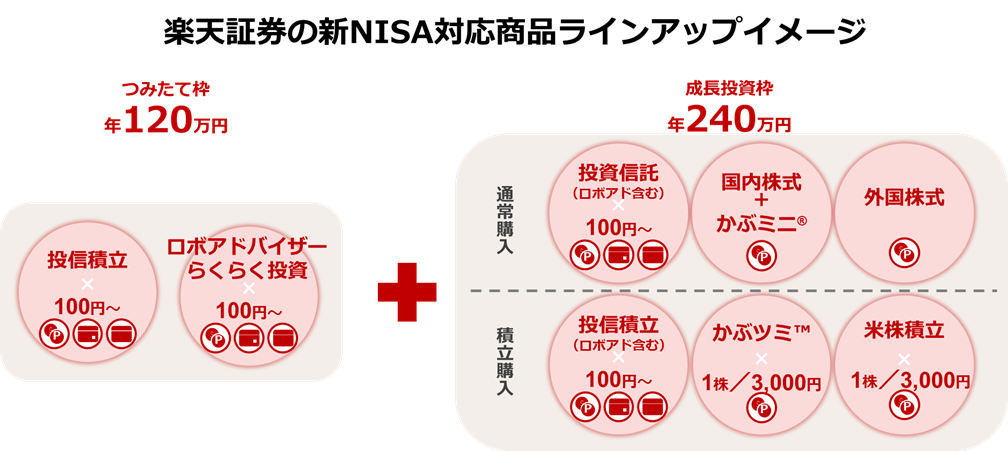新NISA制度は、非課税保有期間が無期限化されるほか、年間投資枠が最大360万円に拡充されるなど、現行NISA制度以上にライフイベントに応じた長期の資産形成がしやすい制度に生まれ変わります。楽天証券は、あらゆるお客様のお金に対する将来の不安や悩みを解消する1つの方法として、新NISA制度をよりお得に、より使いやすくご利用いただけるよう対応を進めており、つみたて投資枠の月額10万円を全額キャッシュレス、かつ、ポイントを獲得しながら可能にする決済方法(「楽天カード」クレジット決済・「楽天キャッシュ」決済)の提供、各投資枠に適した商品ラインアップを拡充しています。