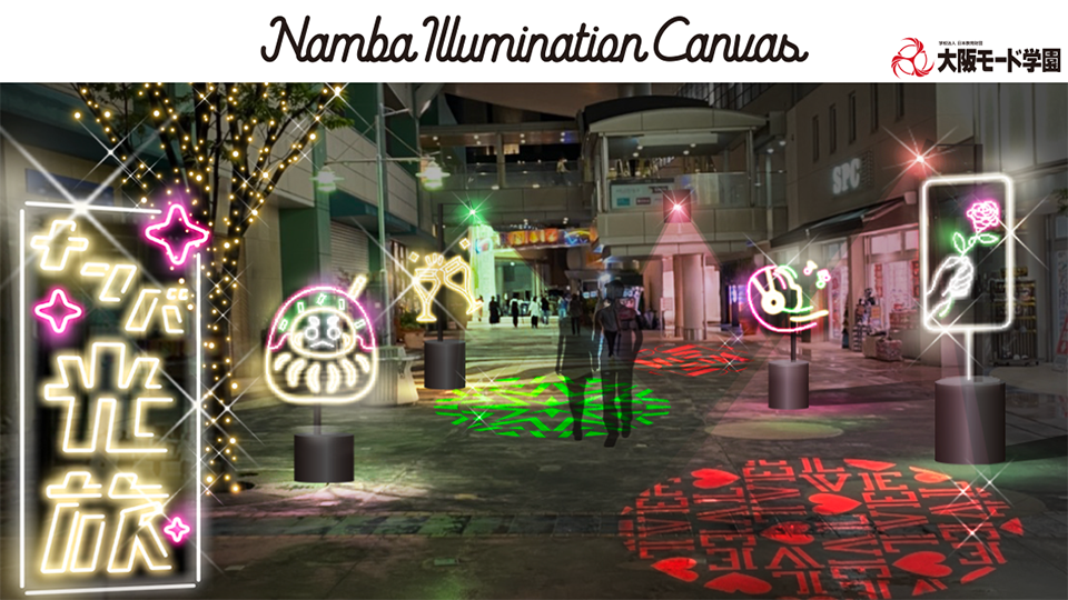 大阪モード学園インテリア学科、グラフィック学科は、2022年11月11日(金)から南海電気鉄道株式会社、株式会社高島屋が開催する共同イルミネーション「なんば光旅」で、なんばCITYとなんばパークスをつなぐ、なんばカーニバルモールをキャンバスに見立て、そこにイルミネーションアートを描くプロジェクト「Namba Illumination Canvas」に参加します。
