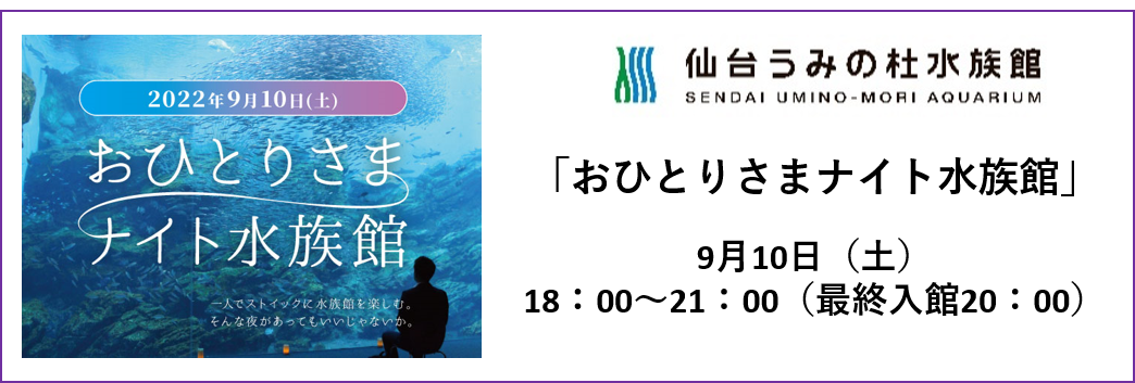 『仙台うみの杜水族館』と上越市立水族博物館 『うみがたり』では、2022年9月10日(土)の閉館後、ひとりでストイックに水族館を楽しむ大人のナイトイベントである“おひとりさま”イベントを同時開催いたします。