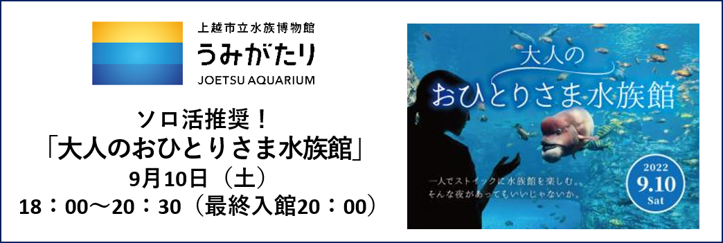 2022年3月には、上越市立水族博物館 『うみがたり』で、初めての“おひとりさま”イベント「大人のおひとりさま水族館」を開催し、「ソロ活なので落ち着いてじっくり水族館を楽しむことができた」、「静かな雰囲気と自分の時間を満喫できた」など大変好評をいただきました。
