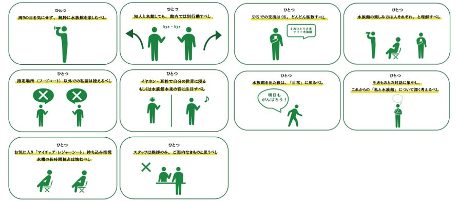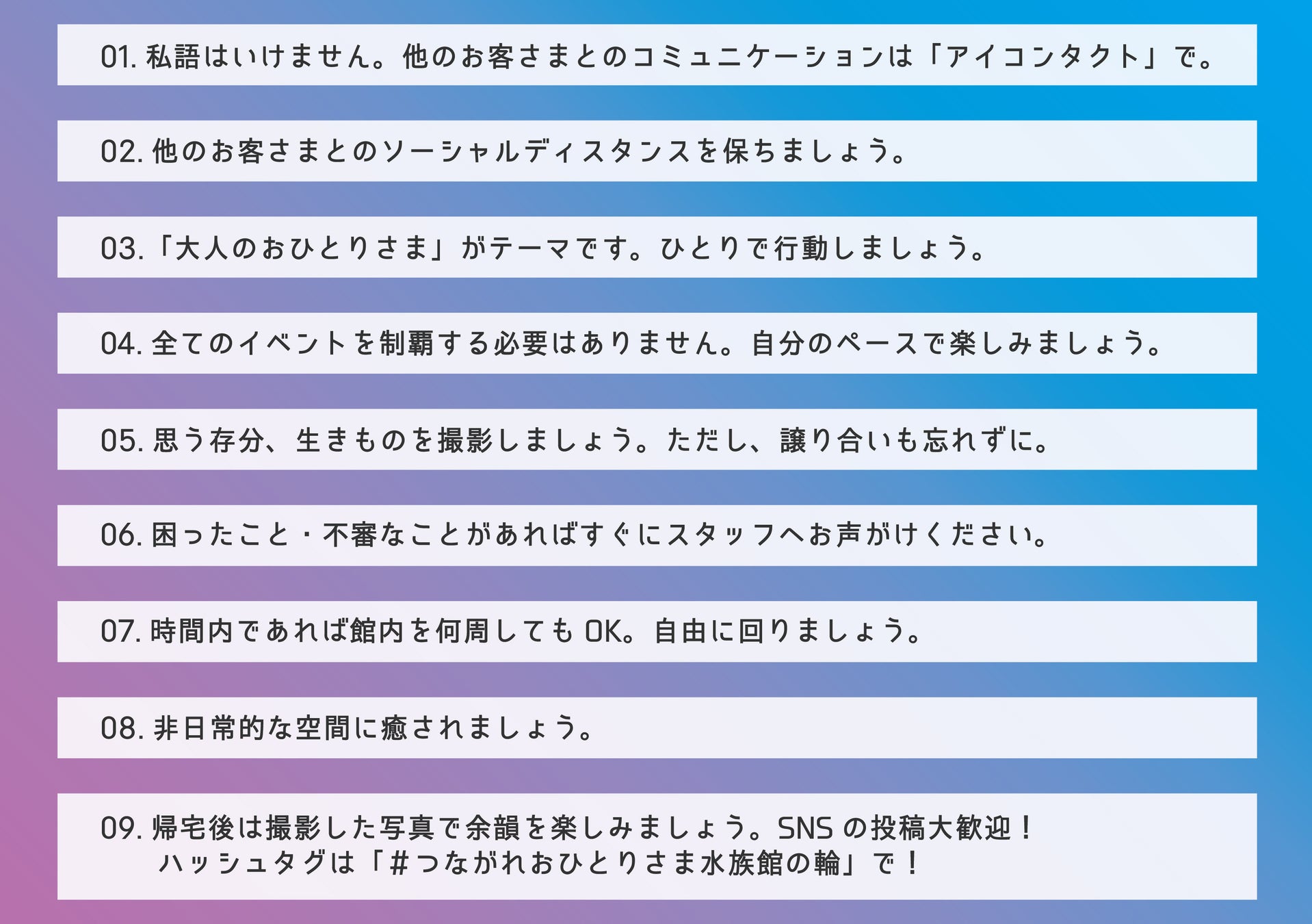 「大人のおひとりさま水族館」では、皆さまが安心してお楽しみいただけるよう、「楽しむための9つのマナー」を設定しております。