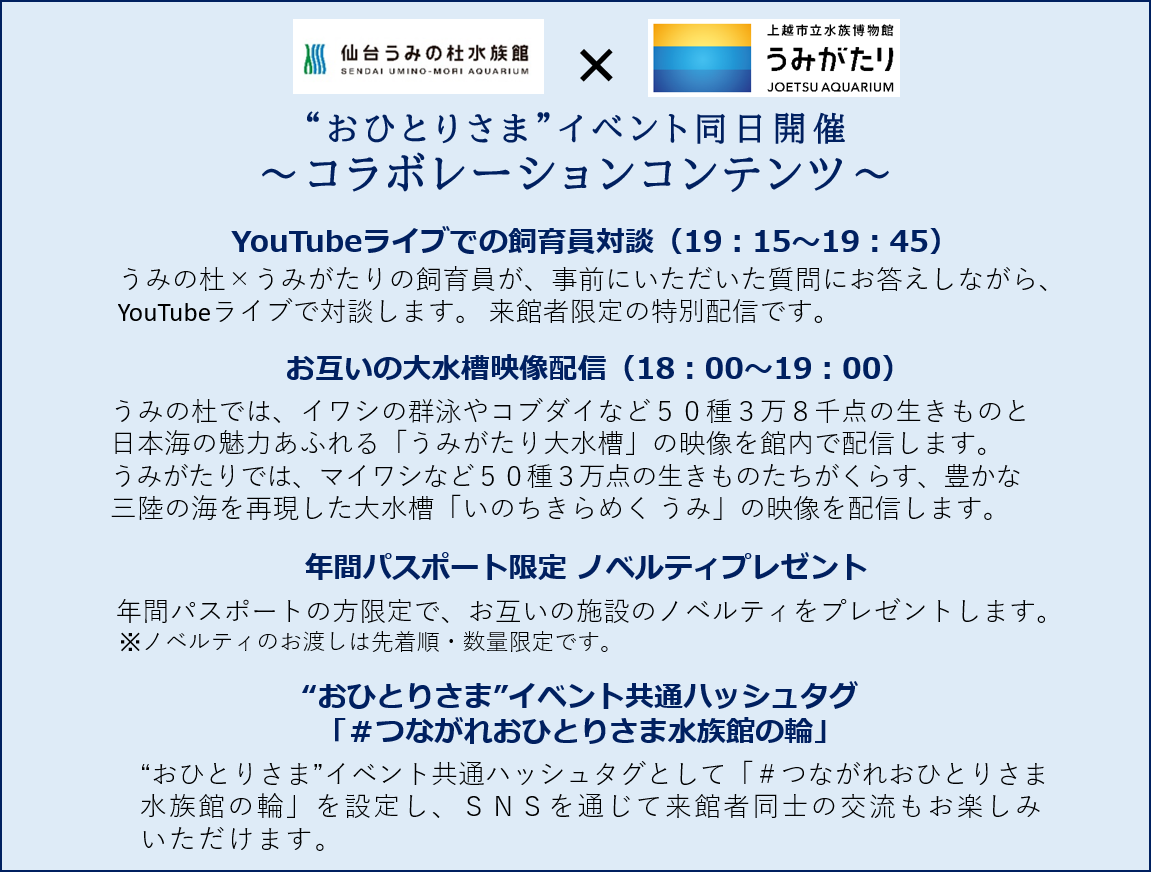 そして、今回『仙台うみの杜水族館』と上越市立水族博物館 『うみがたり』の“おひとりさま”イベントの同時開催が実現し、より多くの方にお楽しみいただけるイベントへと進化しました。グループ施設のつながりを活かしたコラボレーションコンテンツで、さらに充実した時間をお過ごしいただけます。