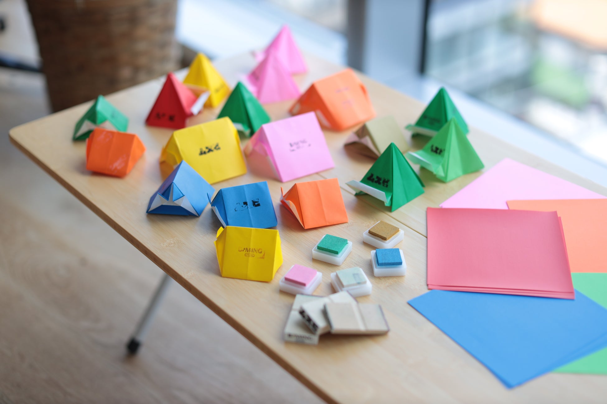 店内の特設コーナーにて、折り紙でテントを制作するワークショップ。出来上がったテントはお好みのスタンプを使ってカスタマイズしたデザインを楽しむことができます。ファミリーでの参加もおすすめです。