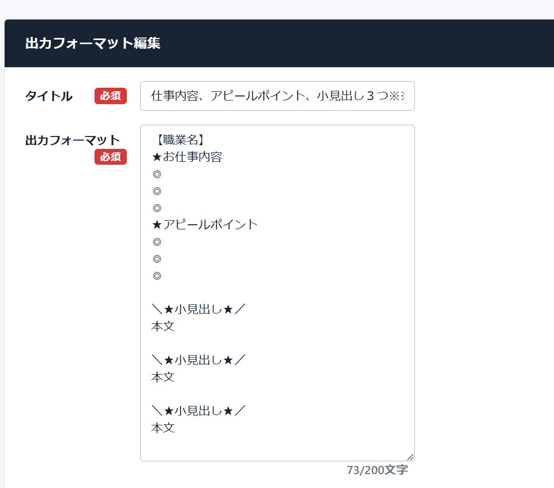 例えば、求人媒体に出稿している項目に合わせて登録したフォーマットを選択して文章を生成すれば、後から文章を媒体用に調整する手間を省くことができます。
