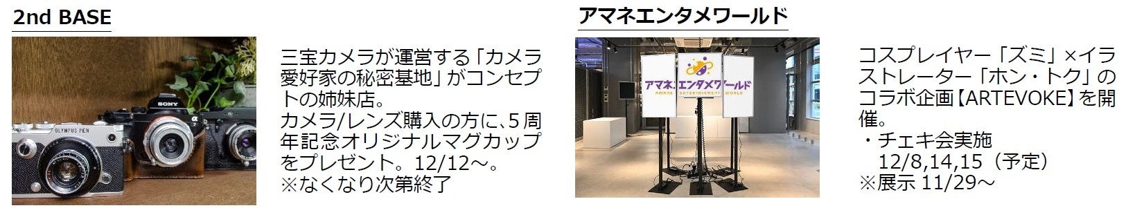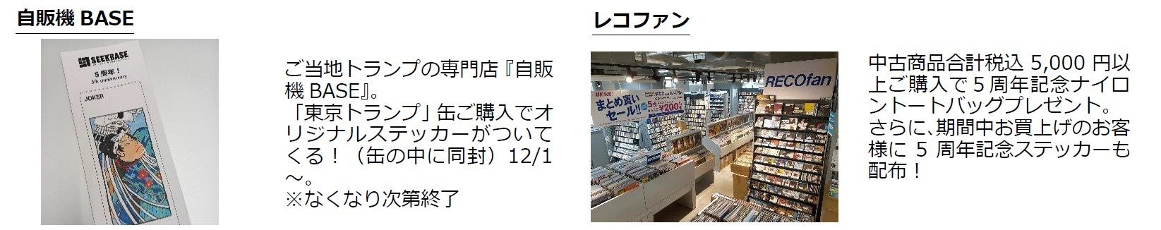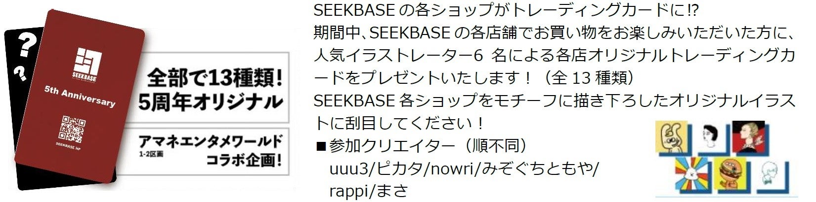 ■『SEEKBASE AKI-OKA MANUFACTURE』は、本年12月12日で開業5周年を迎えます。日頃のご愛顧の感謝を込めて、人気イラストレーターによるトレーディングカードプレゼントや各キャンペーンを実施いたします。