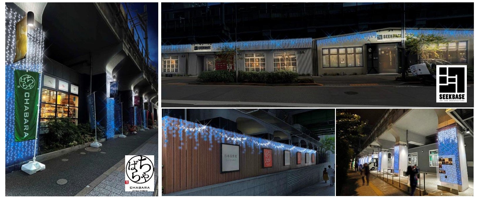 日本全国の食の逸品が集まる「食文化の街」CHABARAと、「大人の基地」SEEKBASEでは、秋葉原UDX(運営管理:NTT都市開発株式会社)が開催する「UDX Snow Illumination 2024」とコラボし、イルミネーションにより街と高架下で一体となった演出を実施します。光の色を3施設で統一し、秋葉原駅電気街口から続く1本道の歩道全体を明るく優しいブルーの光で照らします。