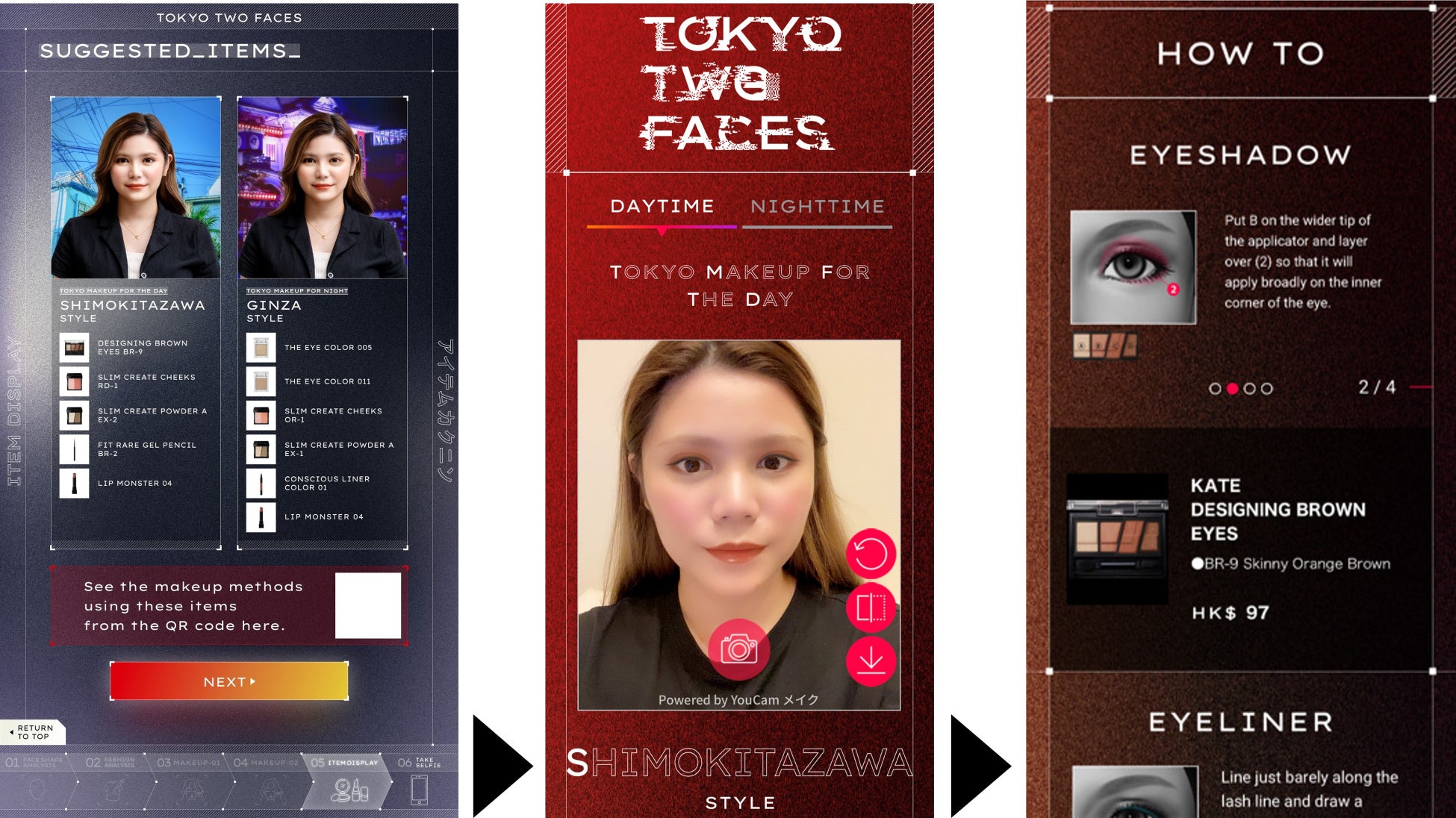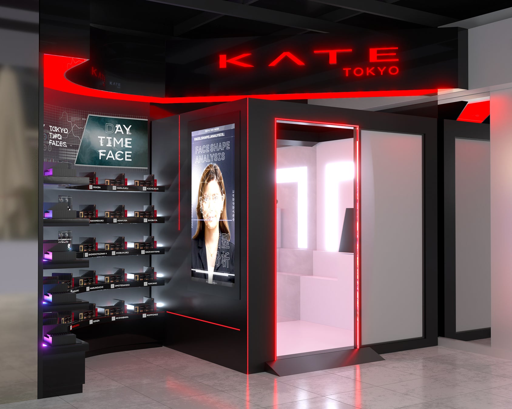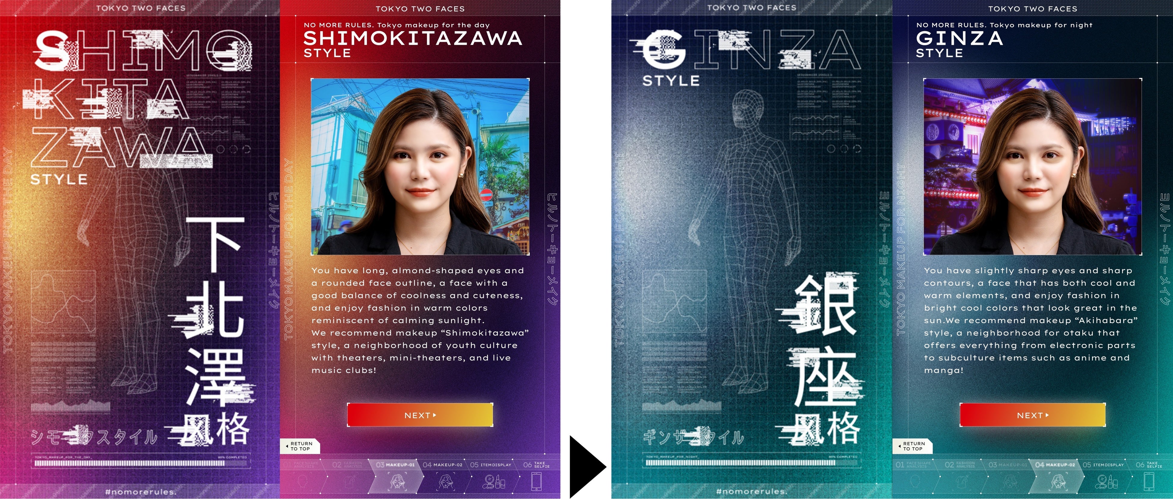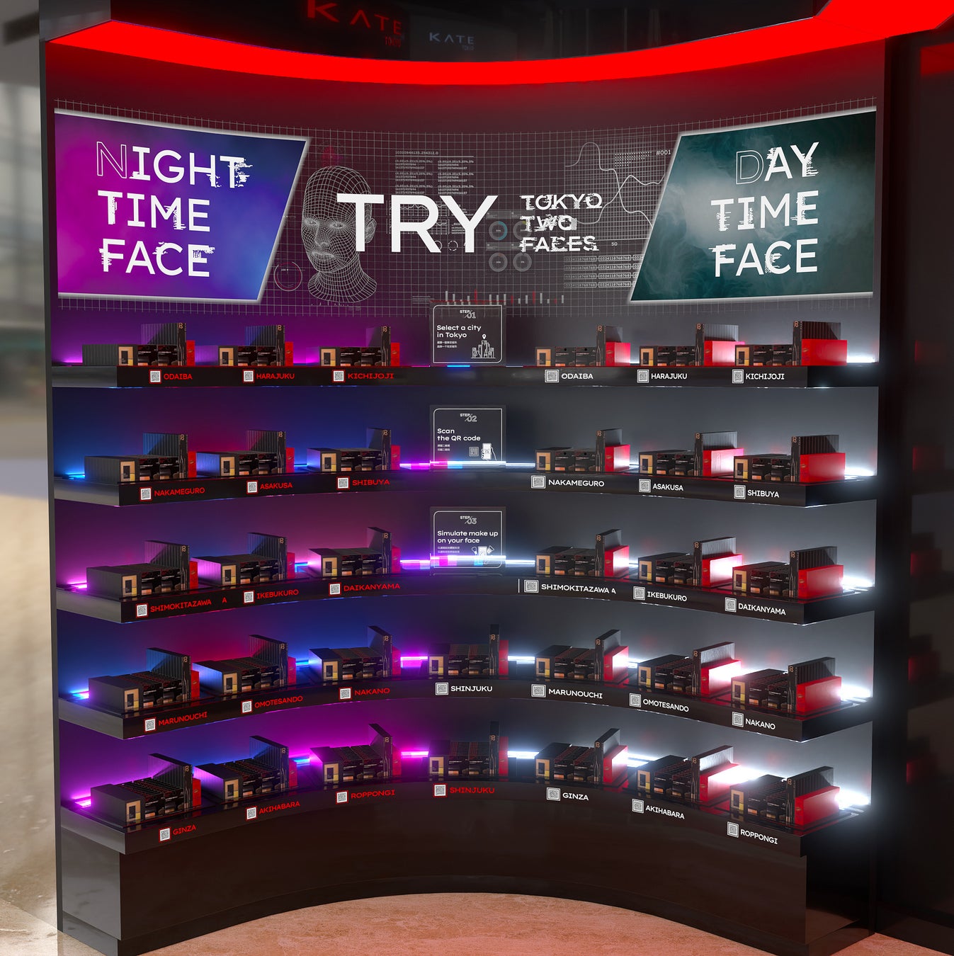 「TOKYO TWO FACES」はKATE独自ロジックによるAI技術による顔印象分析とAI技術による洋服の色分析を融合させた世界で唯一のレコメンドロジックを確立。あなたの顔印象とその日のファッションを分析し、TOKYOの都市特徴になぞらえて、あなたにおすすめのメイクをレコメンドします。
