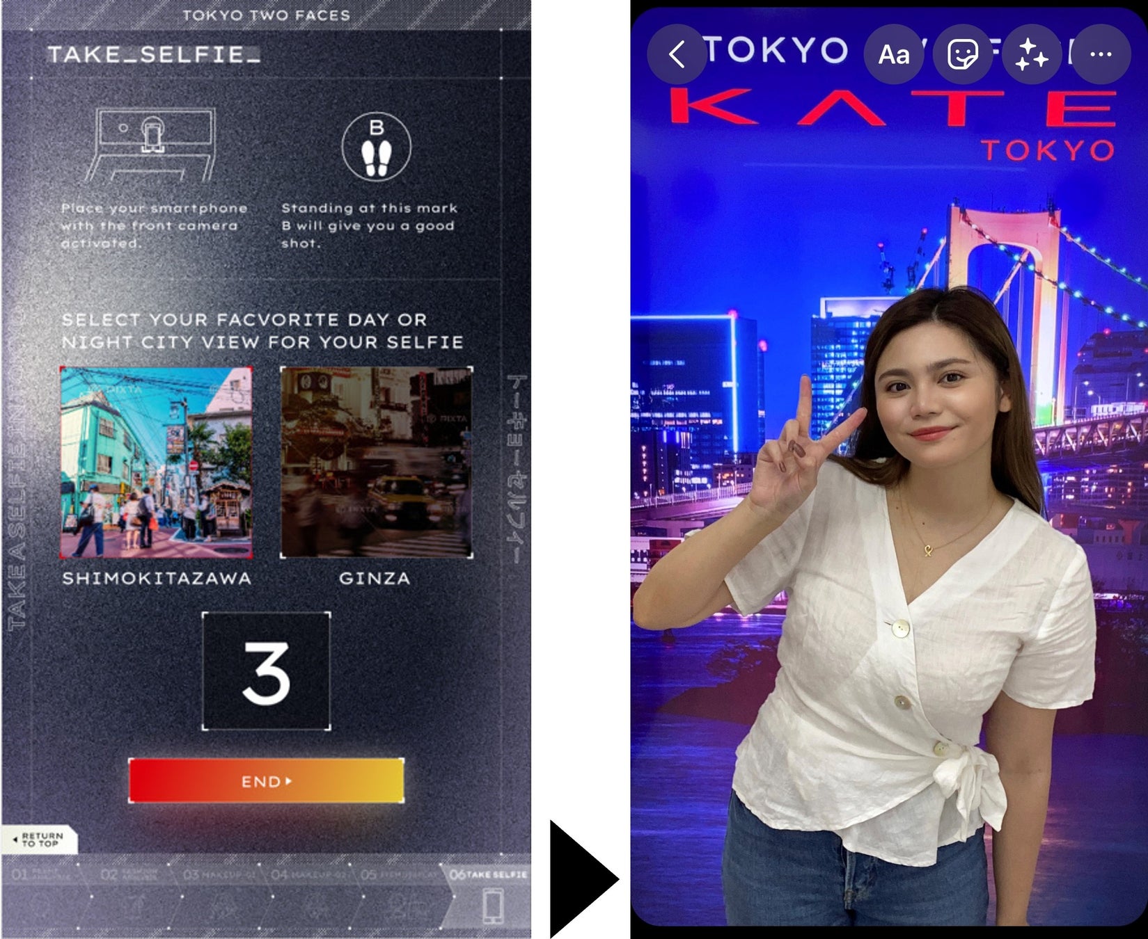 ④分析結果に合わせてユーザーの背後にある85インチの大型モニターにレコメンドされたTOKYOの都市風景が投 影。ユーザーのスマホで撮影することで、TOKYOにいるかのようなSNS映えする写真撮影が可能。
