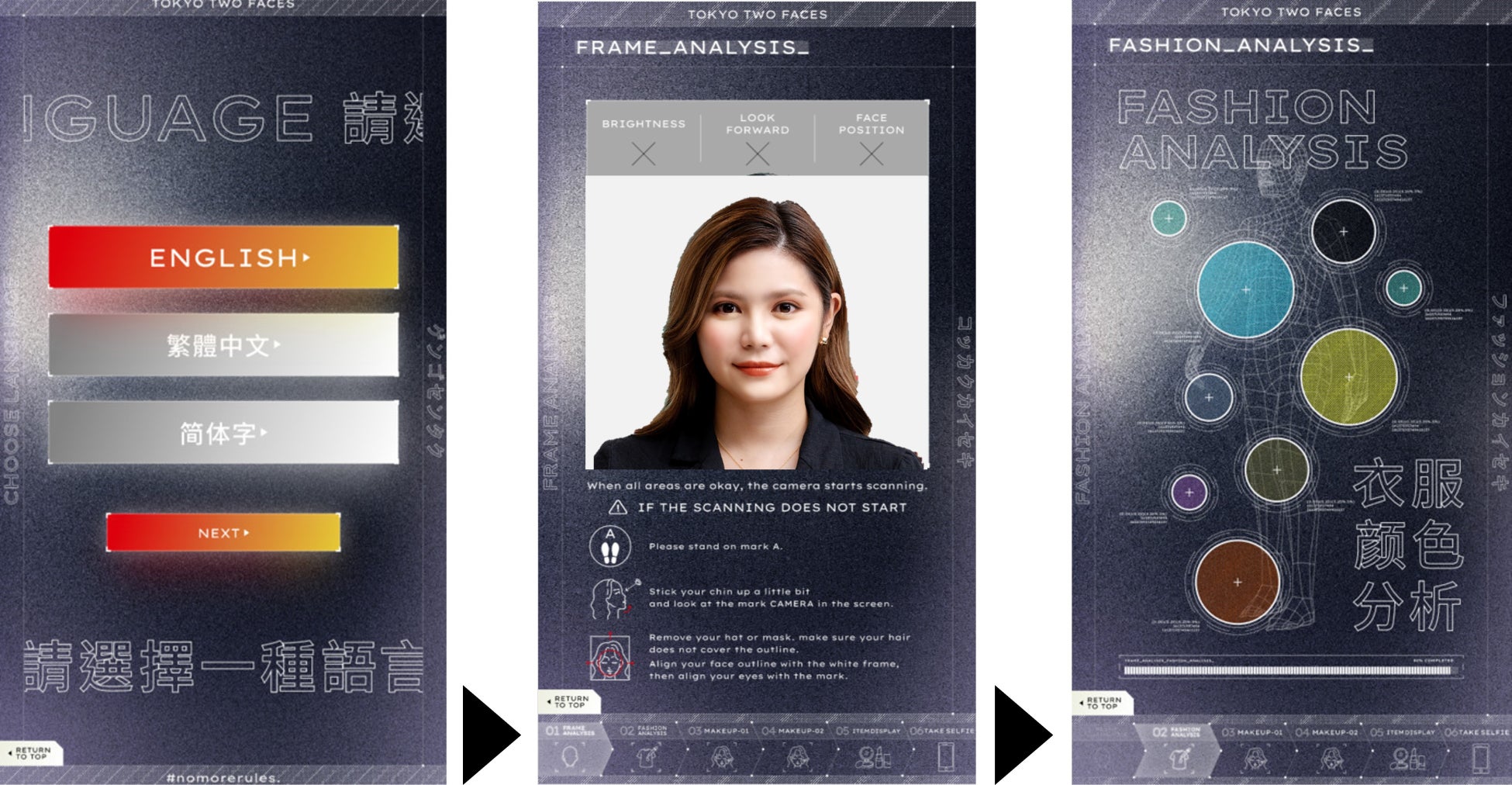 このデバイスではカメラで取得したユーザー顔印象と、その日の洋服の色を分析し、ユーザーの特性に合わせたTOKYOの都市をレコメンドします。さらにその都市のイメージに合ったメイクを体感できるシミュレーターや分析されたTOKYOの都市風景を背景に写真がとれるなど機能を盛り込み、まるでTOKYOを旅しているような体感ができます。香港のユーザーに日本の文化を体感してもらいつつ、KATEのブランドの認知・体感の場を提供いたします。