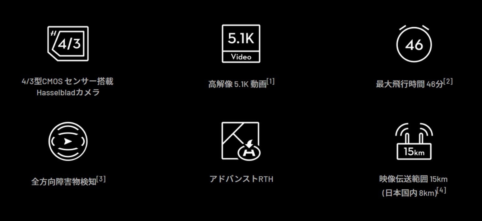 5.1K / 50fps対応 4/3型CMOSセンサーの Hasselblad カメラを搭載し、最長46分のフライトと低コスト化を実現