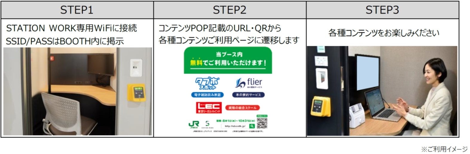 | ○東日本旅客鉄道株式会社(本社:東京都渋谷区、代表取締役社長:深澤 祐二/以下「JR東日本」)と株式会社TechnoBlood eSports(本社:東京都台東区、代表取締役社長:森島 健文/以下「TechnoBlood eSports」)は、WEB会議等に最適な空間を提供する「STATION BOOTH」において、WEB会議等に限らず様々な利用方法を見出していくために、ビジネスコンテンツの実証実験を開始します。 ○本実証実験では、電子雑誌読み放題「タブホスポット」、本の要約サービス「flier」、資格の総合スクール「LEC」を無料で体験いただくことが可能です。 ○2022年8月1日(月)から10月31日(月)の間、東京駅、新宿駅、池袋駅、立川駅の各拠点において実証実験を行い、ビジネスコンテンツのニーズを検証し、今後のサービス向上に取り組んでまいります。 |