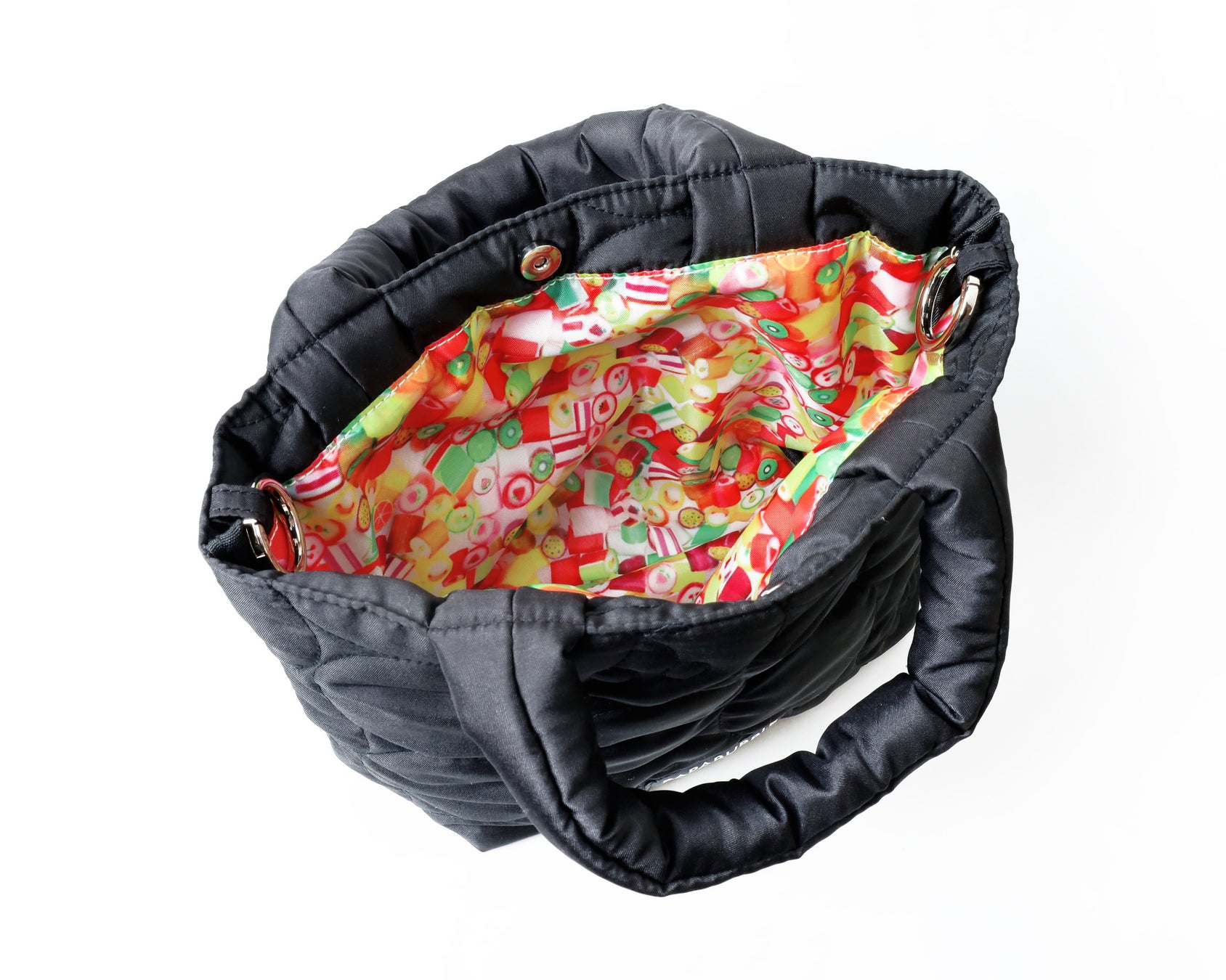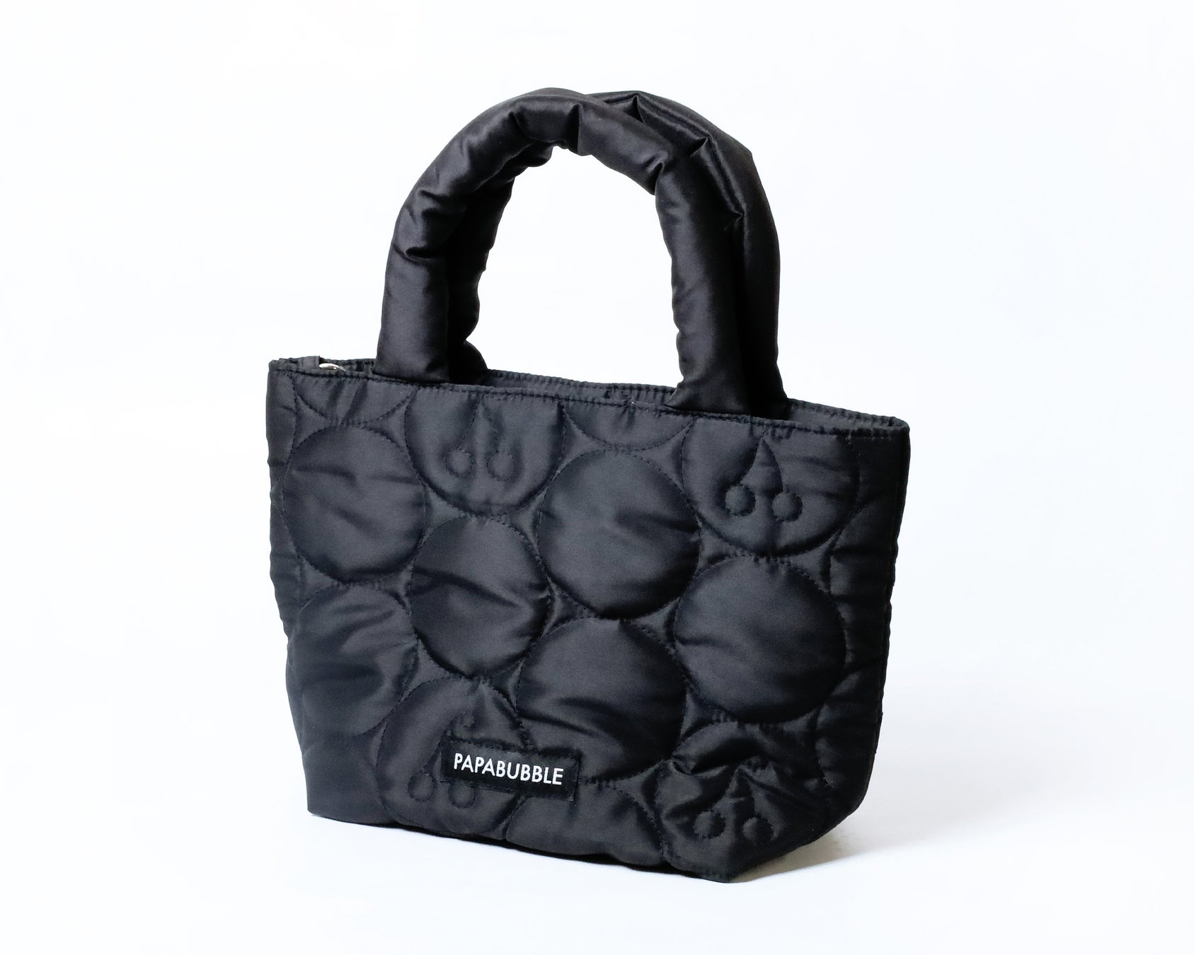温かみのあるキルティング素材のバッグには、パパブブレの人気キャンディ柄「チェリー」をデザイン。裏地にはフルーツミックスをプリントした生地を使用しました。両端にカラビナを備え、お手持ちの紐をプラスすることで肩掛けタイプにもできる仕様です。シンプルながらもこだわりが詰まった、パパブブレらしいオリジナルアイテムとなっています。