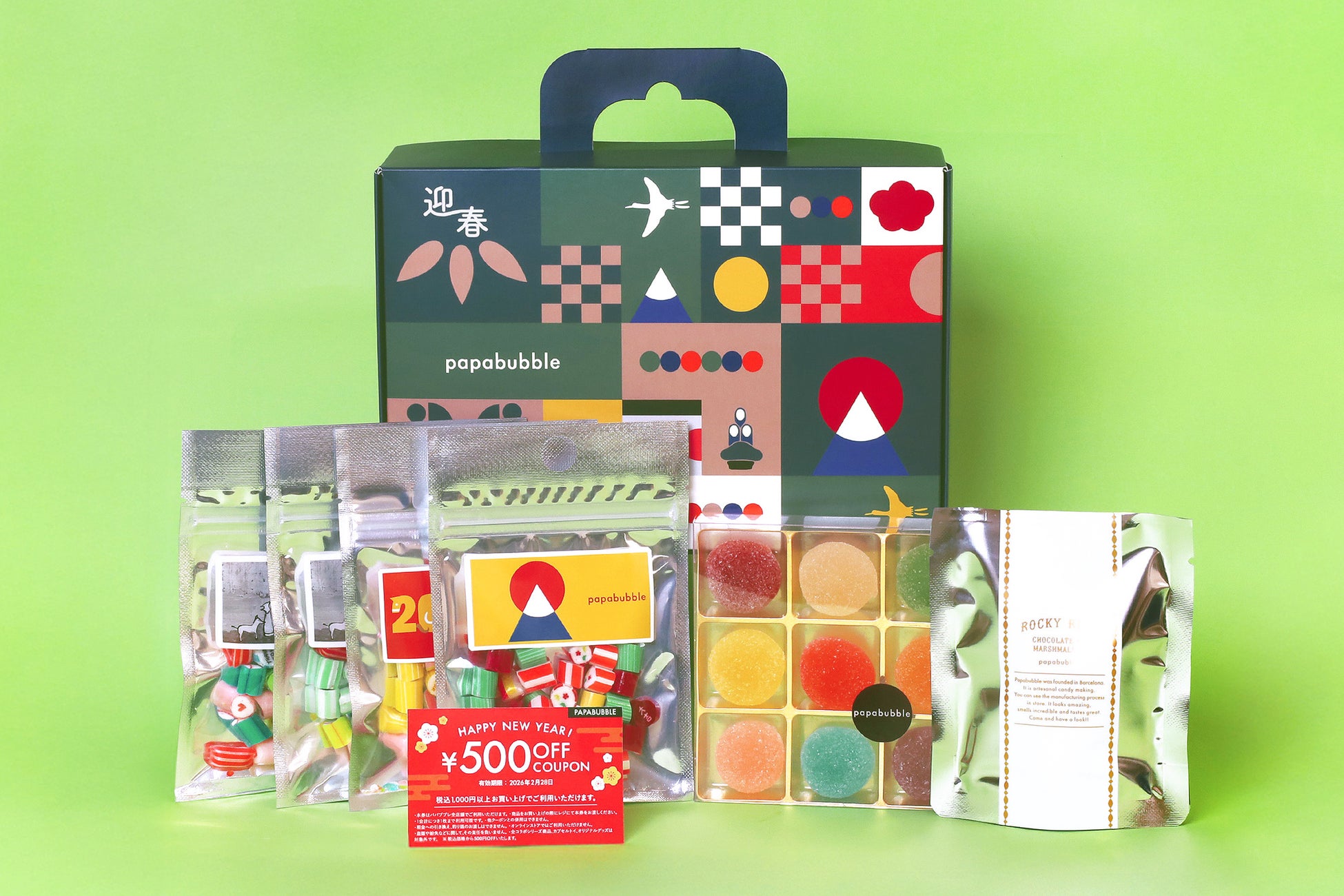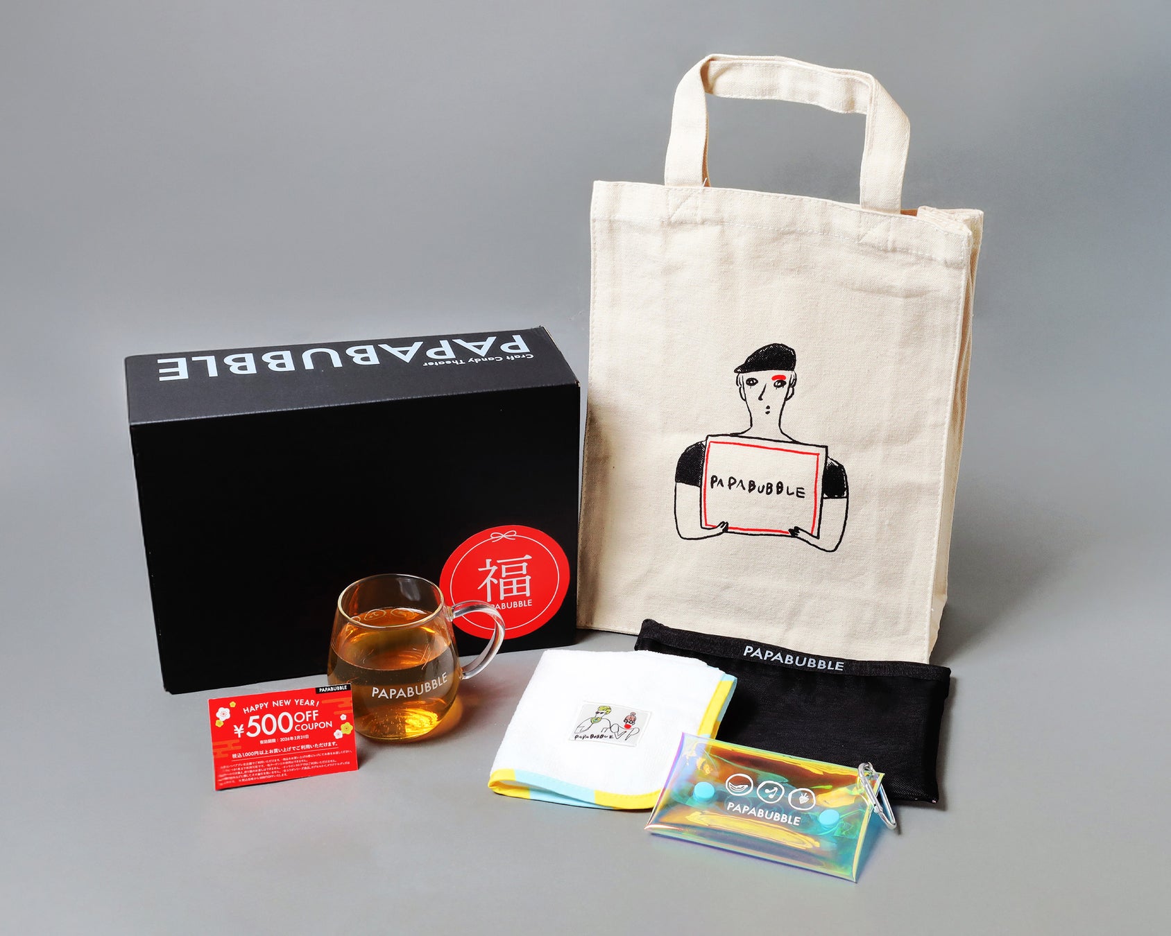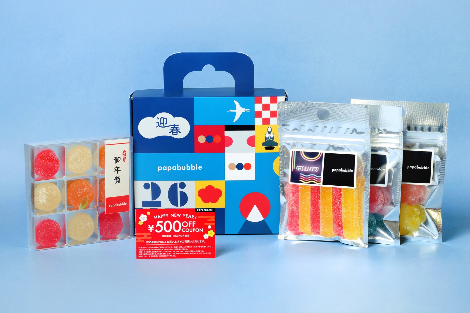 ・内容:アシドグミ×1袋、ランダムグミ×1袋、ハードグミ×1袋、お年賀バブレッツ×1箱、500円引きクーポン×1枚