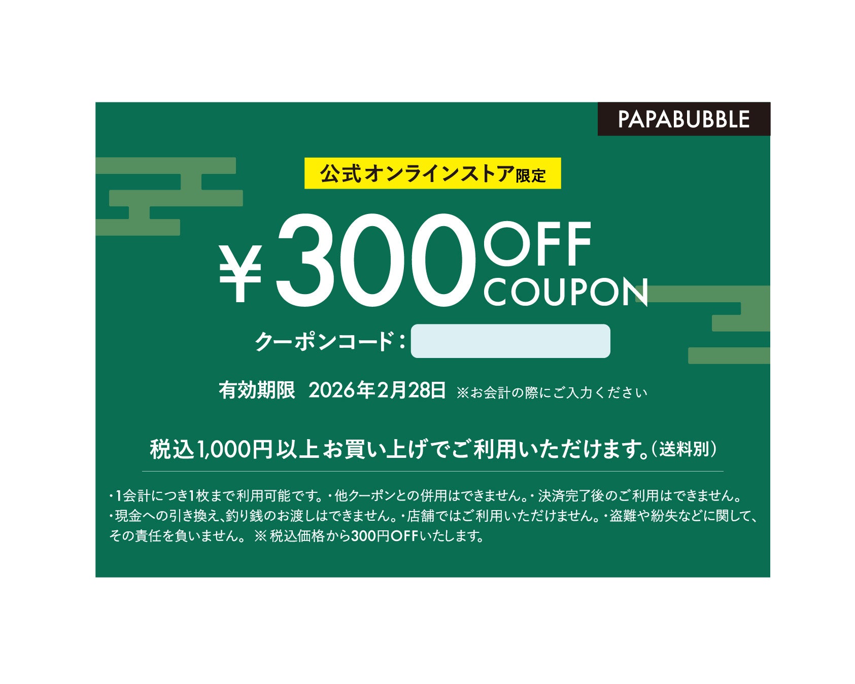 1会計につき1枚、1,000円以上のお買い物で使える300円OFFクーポンをプレゼントいたします。
