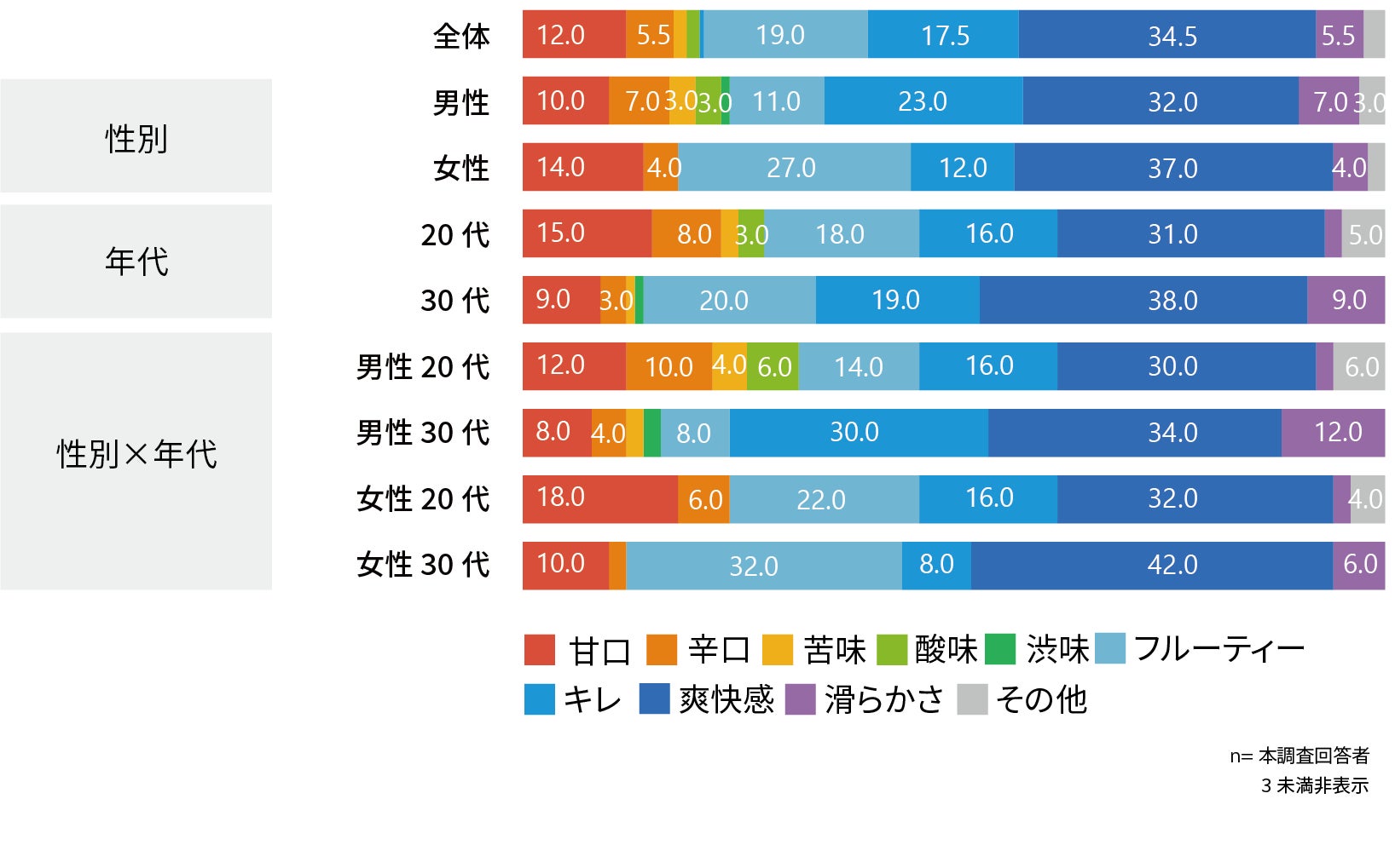 女性30代は"味"で「フルーティー」(32.0%)の支持最も高く、男性30代からの支持は最も低い(8.0%)。