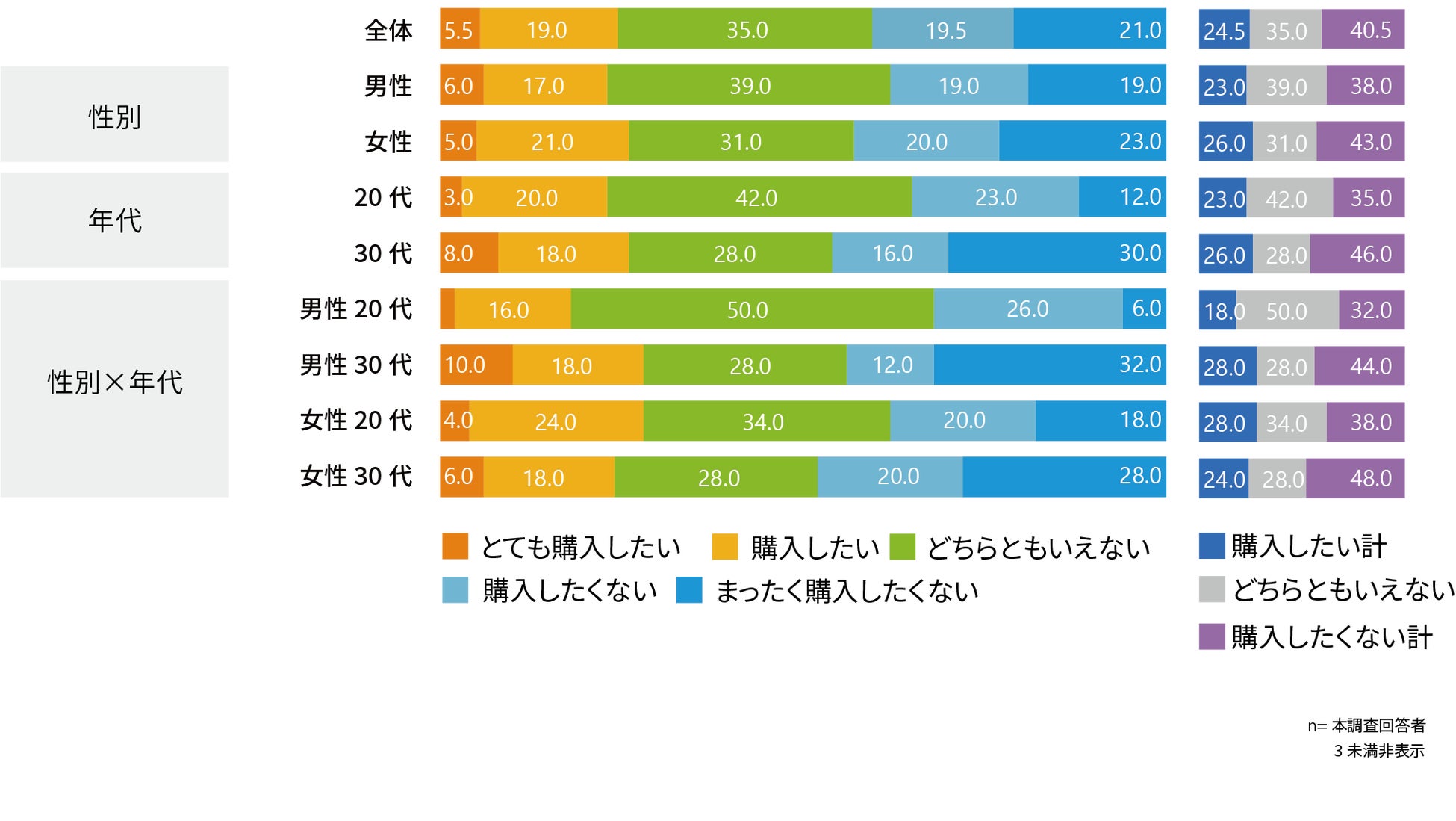 性年代別で見ると、30代男性の3割以上が「購入したい」と答え、他と比べて高い。