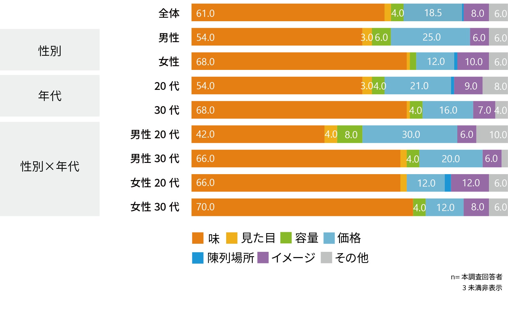 全体でみると普段日本酒を購入しない理由として6割以上の人が「味」と回答し、 次に多い「価格」(18.5%)の3倍以上であった。 性年代別で見ると、20代男性は「味」が顕著に低く、代わりに「価格」が顕著に高い傾向が見られる。