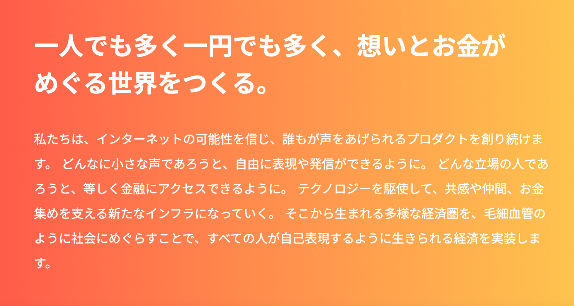 「一人でも多く一円でも多く、想いとお金がめぐる世界をつくる。」をミッションに掲げ、国内最大級のクラウドファンディング「CAMPFIRE」を運営しています。個人やクリエイター、企業、NPO、学校、地方自治体など様々な方に活用いただいています。