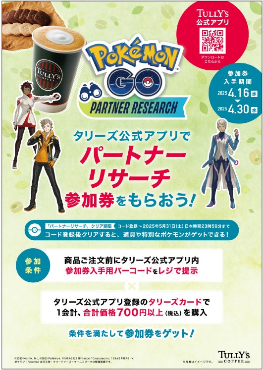 タリーズコーヒー店舗で開催する「『Pokémon GO』パートナーリサーチ 参加券プレゼントキャンペーン」は、「タリーズ公式アプリ」内の参加券入手用バーコードを商品ご注文前に従業員(フェロー)に提示の上、「タリーズ公式アプリ」登録のタリーズカードで1会計700円以上(税込)お買い上げいただくと参加券を取得できます。