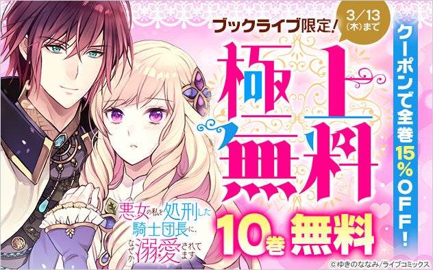 TOPPANホールディングス株式会社のグループ会社である、株式会社BookLive(本社:東京都港区・代表取締役社長:淡野 正)は、運営する総合電子書籍ストア「ブックライブ」にて、3月13日(木)までの期間限定で、『悪女の私を処刑した騎士団長に、なぜか溺愛されてます』(ゆきのななみ/ライブコミックス)1~10巻を無料配信するとともに、全巻に使える15%OFFでご購入いただける特別クーポンを配布いたします。