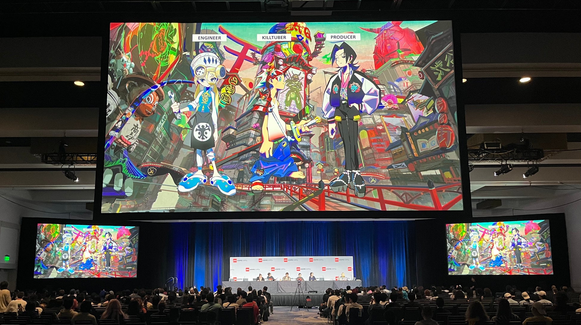海外での公開も目指す本作としては初となる北米公式イベント参加で、ステージには監督の栗林和明とアニメーションプロデューサーの野田楓子が登壇。プロジェクトの誕生ストーリーや監督の作品づくりのユニークなポイントなど舞台裏の制作トークをはじめ、日米同時となる主演声優・一部本編映像の発表といった多岐にわたるプログラムを実施しました。約2,000名を収容する会場には現地のアニメファンが参加し、特にプロデューサーのリアルな現場体験談や作品の世界観を描いたコンセプトアートの紹介、Q&Aセッションは大いに盛り上がりました。最後のフォトセッションでは「KILLTUBE」コールが巻き起こり、会場全体が熱気に包まれたままイベントは幕を閉じました。