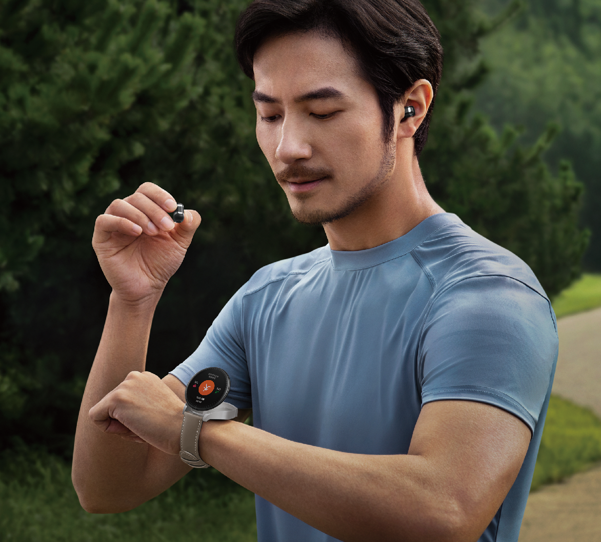 また、AIによる通話時のノイズリダクション機能によって、よりクリアな通話体験をもたらします。骨伝導セン サーとデュアルマイクおよびディープニューラルネットワークによる通話時のノイズリダクションアルゴリズムが搭載されており、周囲のノイズを抑え、あなたの声色を識別・強化してくれるため、通話がよりクリアになります※5。着信時、スマートフォンやスマートウォッチで応答する必要はありません。イヤホンを片方装着するだけですぐに通話が始められます。また、イヤホンが見つからないときは「イヤホンを探す」機能で、ウォッチからイヤホンを鳴らして探すことが可能です。イヤホンのバッテリー残量もウォッチ画面ですぐに確認することができます。