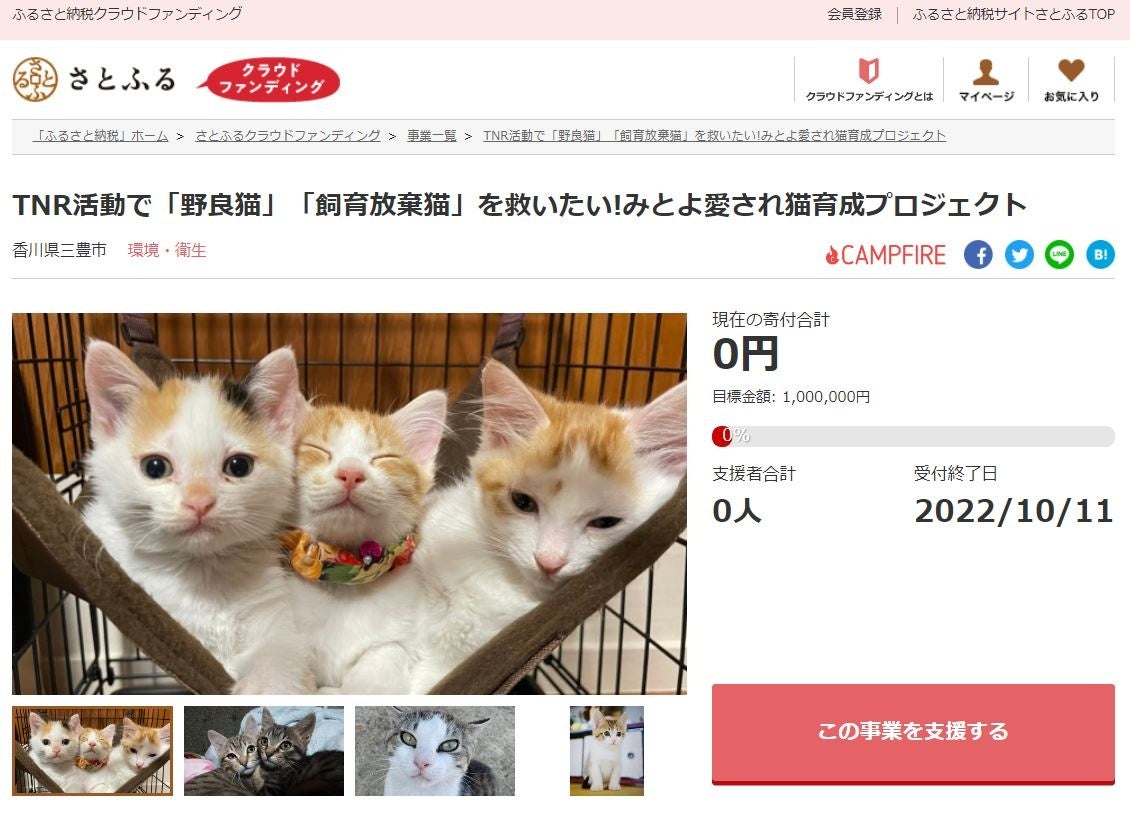 香川県三豊市とふるさと納税ポータルサイト「さとふる」(https://www.satofull.jp/)を運営する株式会社さとふる(本社:東京都中央区、代表取締役社長:藤井 宏明)は、寄付金の使途に応じて事業を立ち上げ寄付を募る「さとふるクラウドファンディング」(https://www.satofull.jp/projects/top.php)にて、野良猫などの不妊去勢手術費や保護猫の治療費を補助し地域の猫を適切に管理することで、人と猫双方にとって居心地の良いまちとなることを目指し、2022年9月1日より寄付受け付けを開始します。