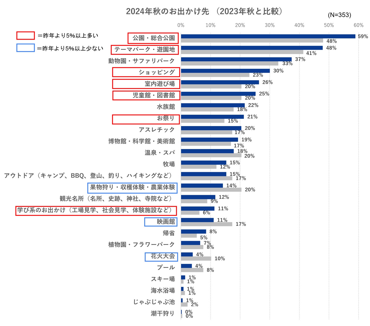 さらには、「ショッピング」「室内遊び場」「児童館・図書館」「お祭り」「学び系のお出かけ」も昨年より増加。一方で、「果物狩り・収穫体験」「映画館」などは昨年より減少していました。