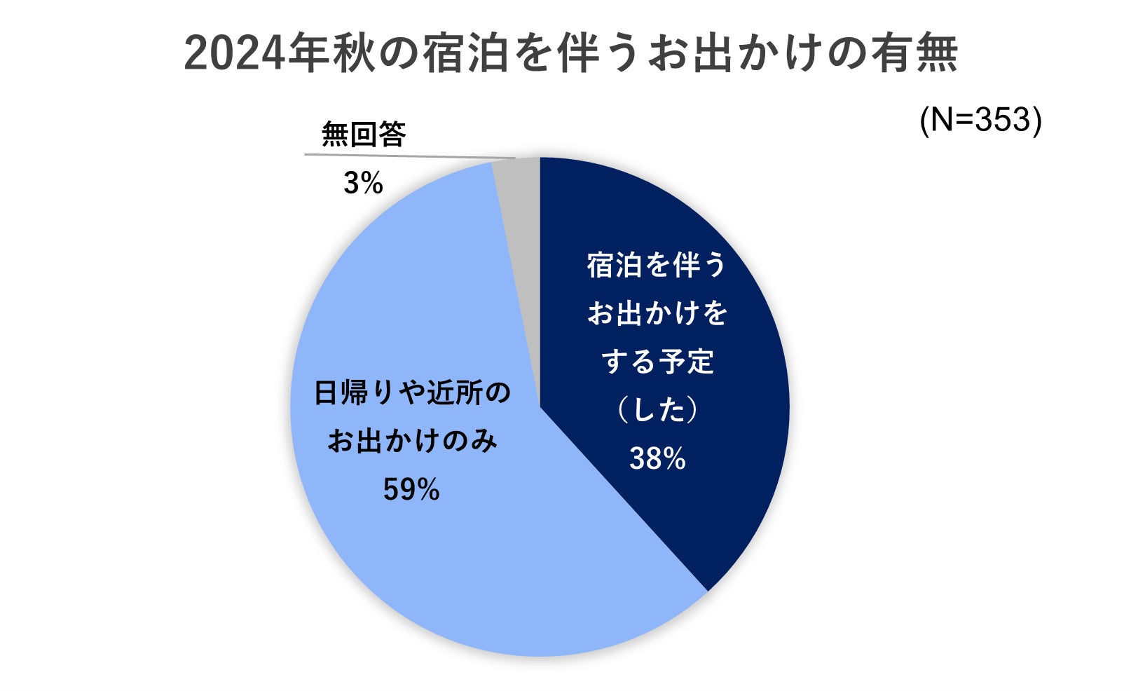 「宿泊を伴うお出かけをする予定(した)」が38%、「日帰りや近所のみのお出かけ」が59%でした。日帰りや近所のお出かけの方が多数派ですが、それでも約4割の家族が宿泊旅行をするという結果は、決して少なくない割合だと思われます。