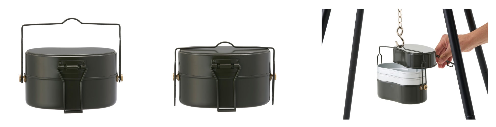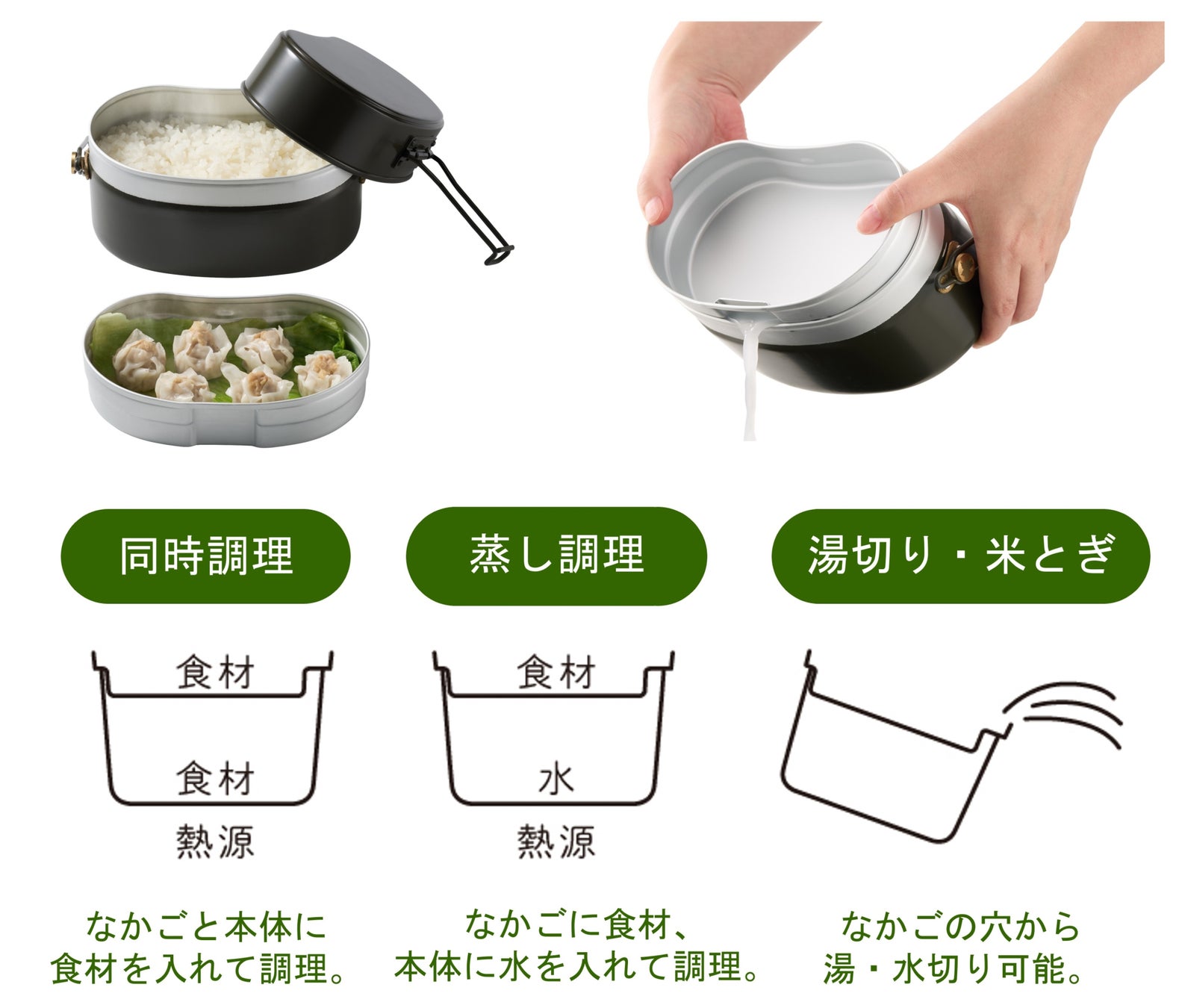 自衛隊規格の金型で製造しているため安心の品質で、アウトドア調理の際に大活躍します。深めのなかごには蒸し料理や湯切りをするための穴を設けており、パスタ料理や米とぎにも最適で、その他様々な調理に対応します。なかごはお皿として使えることはもちろん、本体でごはんを炊きながら、なかごで別のおかずを同時に調理することもできるので、時間短縮にもつながります。