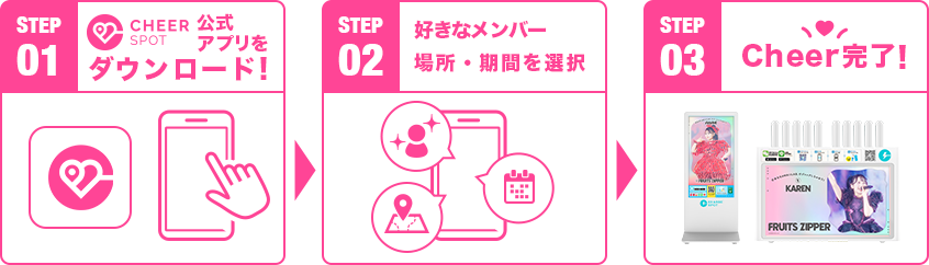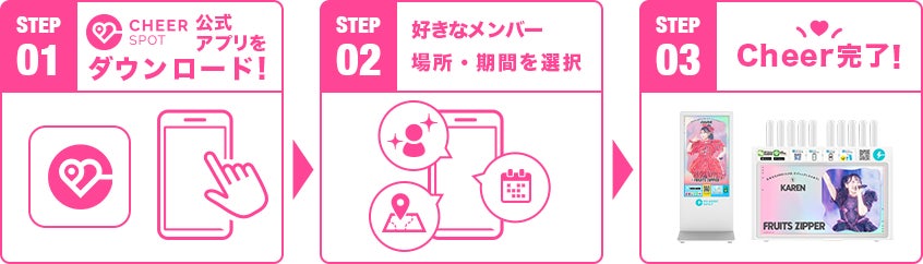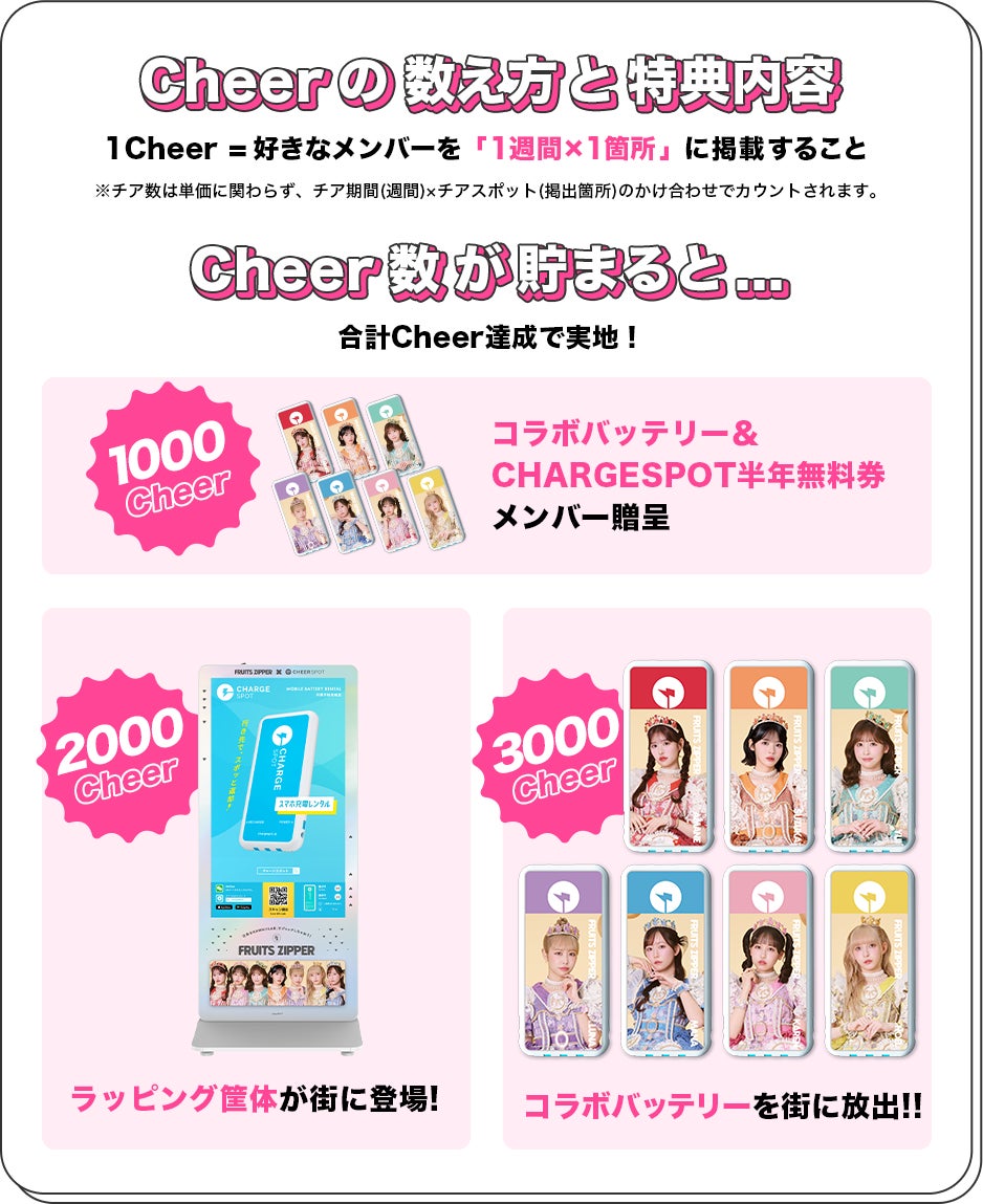CheerSPOTアプリからファンがチア(応援広告を掲載)を贈ることで特典が解放されていく本企画では、各グループ3,000チアの達成を目指しながら、5グループのバトンが繋がれ、カワイイラボ全体で15,000チア達成をゴールに設定。全国のチャージスポットを舞台に、日本中をカワイイラボで埋め尽くすことを目指します。