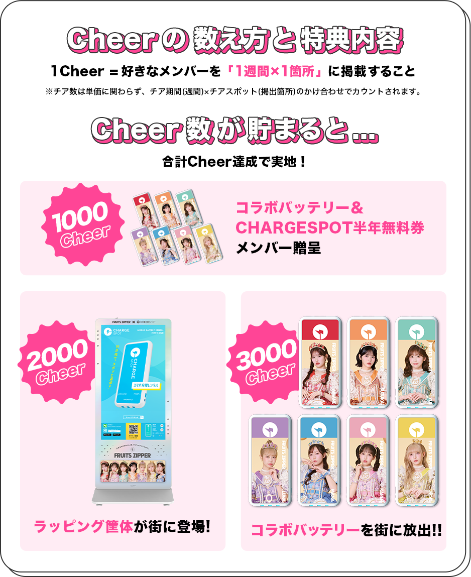 1,000チア達成: メンバーが載ったコラボバッテリー&CHARGESPOT半年無料券をメンバーへ贈呈
