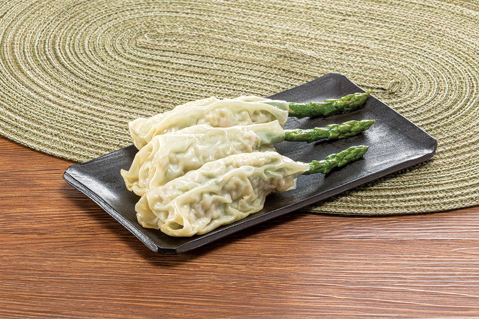 アスパラを一本丸ごと使用。アスパラの甘みが餃子の味を一層引き立てます。