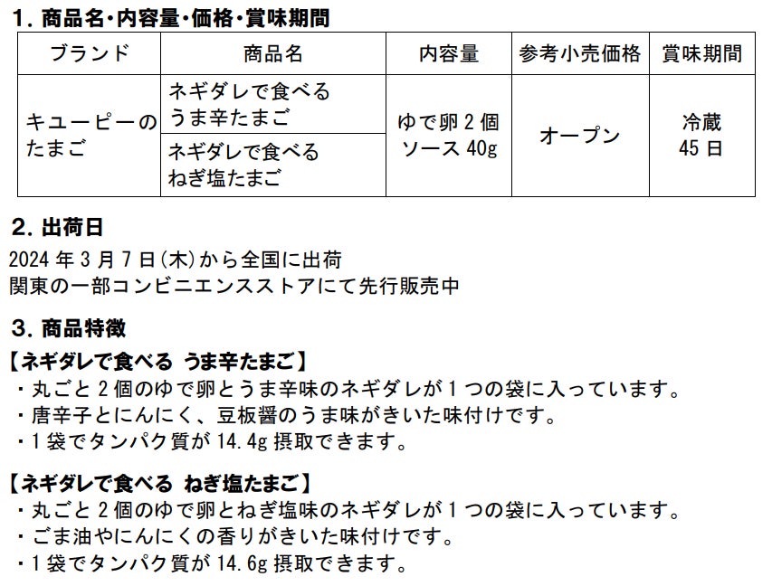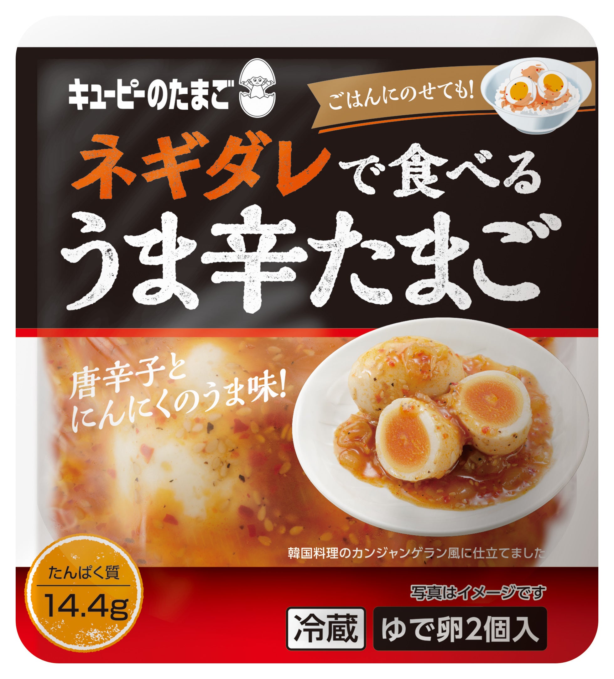 そこで、キユーピーグループ独自の技術を活用し、開封してすぐに食べられる商品を開発しました。ラインアップは、唐辛子とにんにくのうま味がきいた「うま辛たまご」と、ごま油とにんにくの香りが食欲をそそる「ねぎ塩たまご」の2品です。賞味期間が冷蔵で45日間あるため、冷蔵庫にストックしておくこともできます。