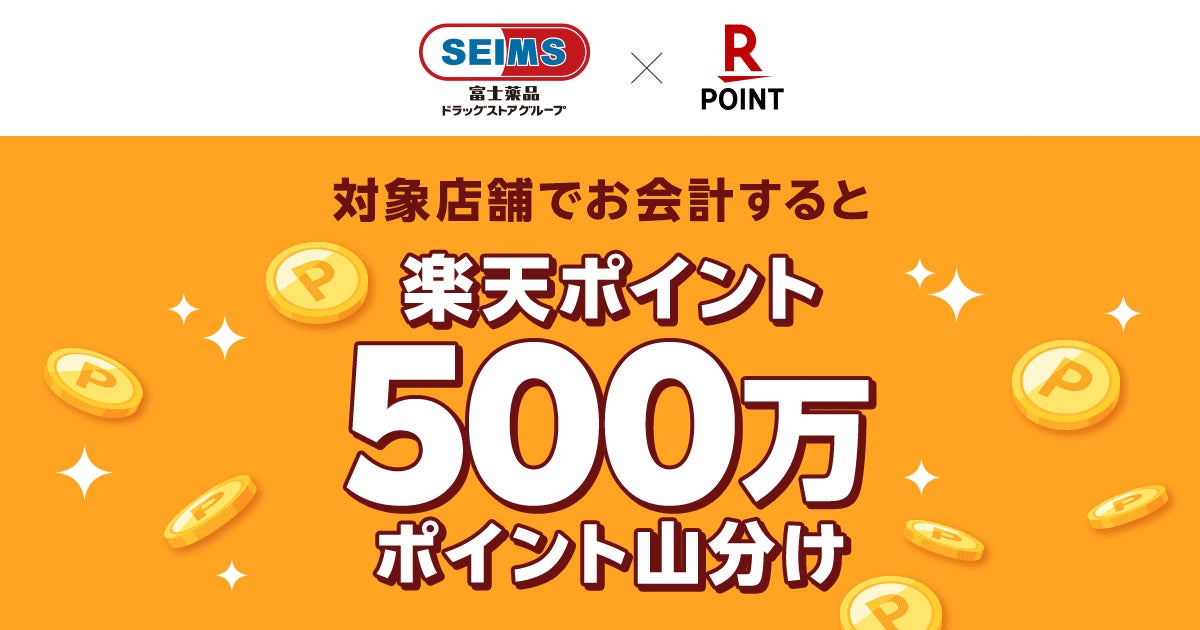 「富士薬品ドラッグストアグループ 楽天ポイントカードサービス開始記念500万ポイント山分けキャンペーン」 |