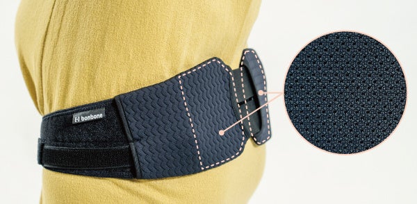 子育てや日常の動作で腰周りに負担を感じるシーンを想定し、樹脂パーツをクッション性のあるカバーで包みました。肌当たりが柔らかく、寝転んでも凹凸を感じにくい設計です。また、通気性のあるメッシュタイプの滑り止め素材で、ムレにくい快適さを実現しました。