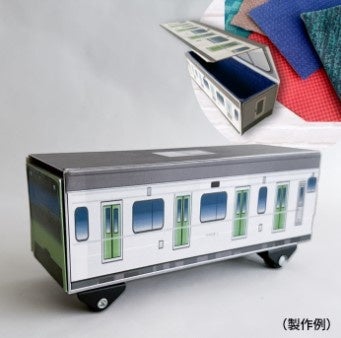 電車柄の厚紙を組み立てて、車輪付きのボックスをつくります。ボックスの内側には、電車の座席に使われる布「モケット」の端材を活用します。