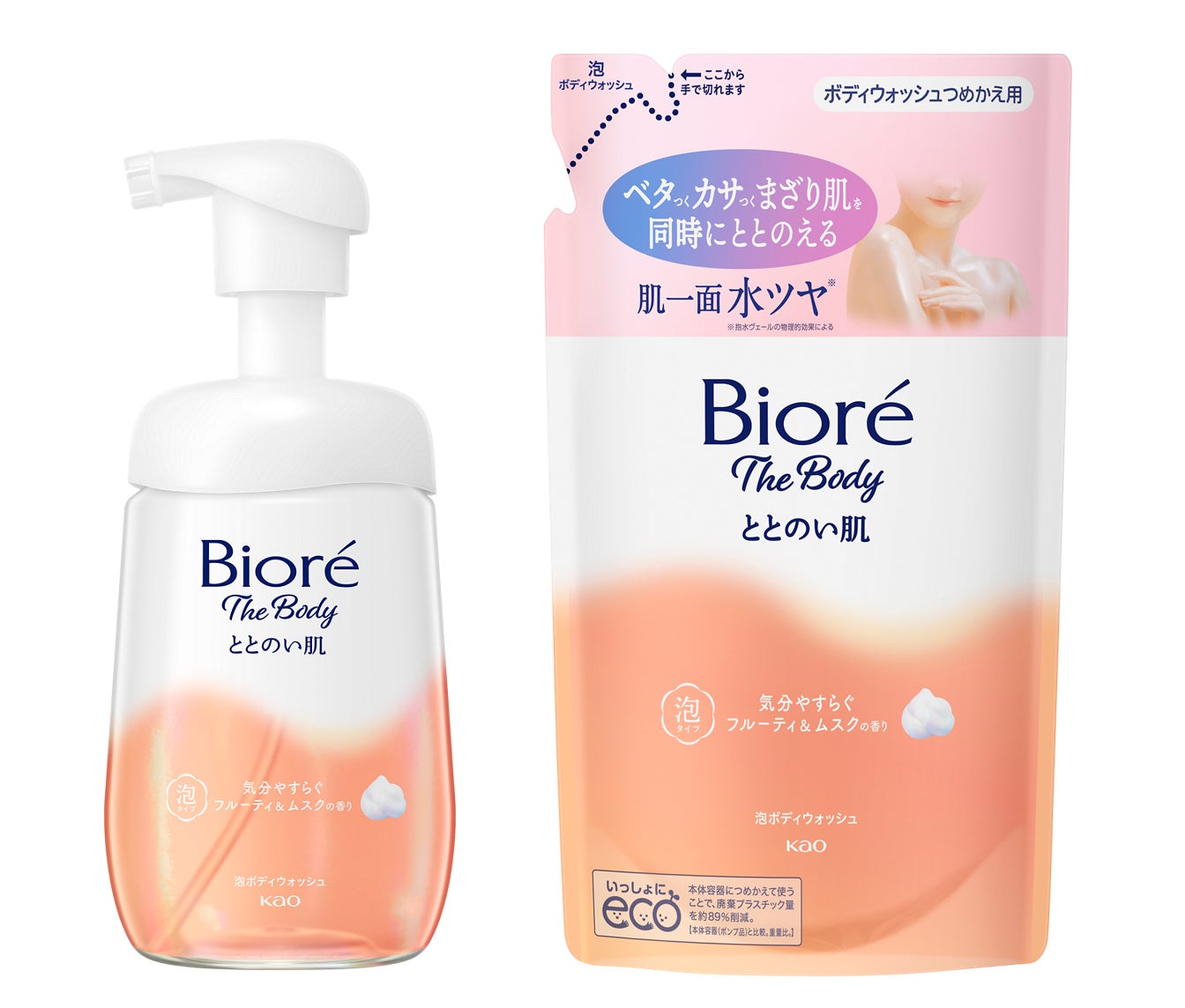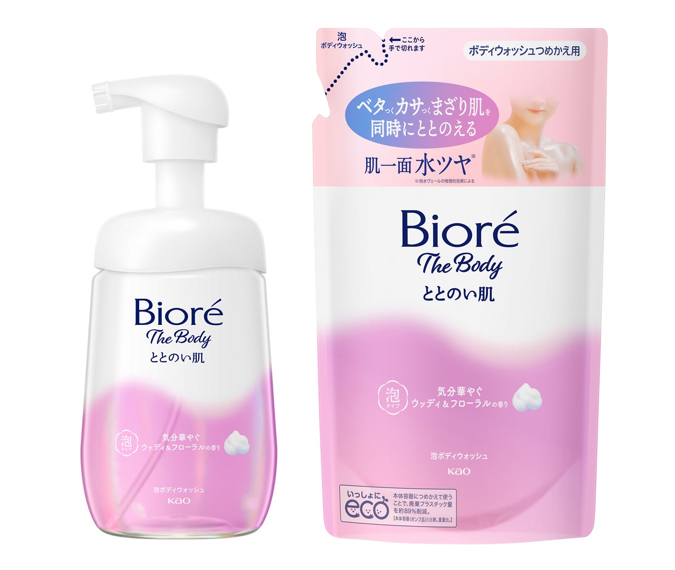 「ベタカサまざり肌*4」を同時にととのえるボディウォッシュ 肌一面水ツヤ*6 ●湿度変化にさらされた「ベタカサまざり肌*4」に ●【世界初*2】花王独自の皮脂選択洗浄成分*3 配合のボディウォッシュ ●全身をととのい肌に導く“皮脂選択洗浄技術” 必要な皮脂を残し、不要な皮脂を洗い流す ●季節でゆらぎがちなデリケートな肌にも ●弱酸性 ●再生プラスチック(PET)ボトル使用 ●オーガニック原料使用(香料の一部) ●香りは2種類(気分華やぐウッディ&フローラルの香り/気分やすらぐフルーティ&ムスクの香り) *2 オレフィンC16スルホン酸Naを配合したボディウォッシュ処方 *3 オレフィンC16スルホン酸Na *4 脂性と乾燥が混在している肌の状態 *6 抱水ヴェールの物理的効果による |