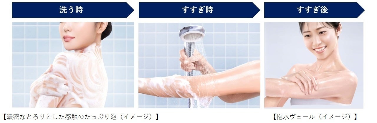 また、花王独自の新ポンプフォーマーを採用。濃密なとろりとした感触のたっぷりとした泡で、からだを包み込むように洗えます。さらに、すすぎ時には “抱水ヴェール”と名付けた水膜を形成。肌一面、ヴェールで覆われて、水ツヤ*6 が現れます。
