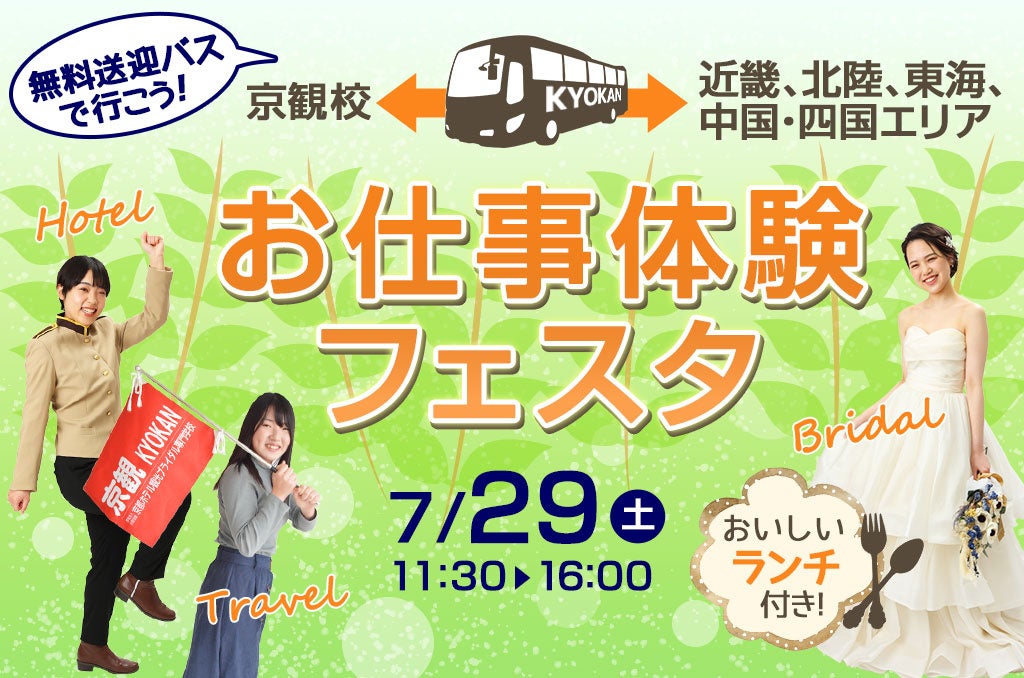 【京都ホテル観光ブライダル専門学校】7/29(土)お仕事体験フェスタを開催!ホテル・旅行・ブライダルの体験授業が受けられる。一部地域より無料バスも運行!