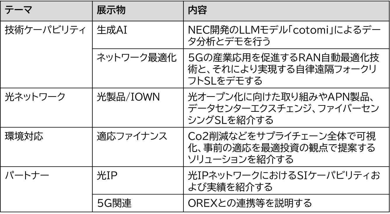 NECの今年のテーマは” NEC's AI Technologies and Networking Strengths”で、 NECの持つ生成AIなどのAI技術および、海底から宇宙まで地球規模でつなぐネットワーク構築力、その両方を通じて新たな社会の構築を支えていくことを訴求します。また、サプライチェーン全体でのCo2削減を通じて地球環境の改善に貢献する技術など、幅広い技術やソリューションを紹介します。