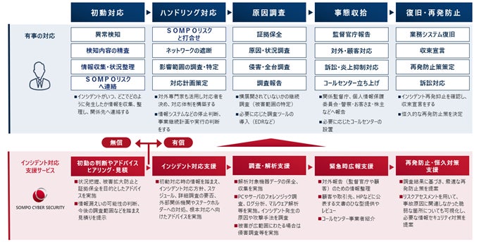 サイバー事故等が発生した場合、本相談窓口にご連絡いただくことで、SOMPOリスクの専門家による無償の初期対応サポートを提供します。具体的には、専門家との早期のミーティングを実施、被害状況に応じた初動対応方針の策定、状況に応じた専門業者による対応チームの組成支援、そしてサイバー攻撃による被害最小化のための支援を行います。本サービスは、サイバー事故等の初動対応方針までを無償でサポートするものであり、初動対応後の費用(フォレンジック調査、コールセンターの立ち上げ等)については有償となります。